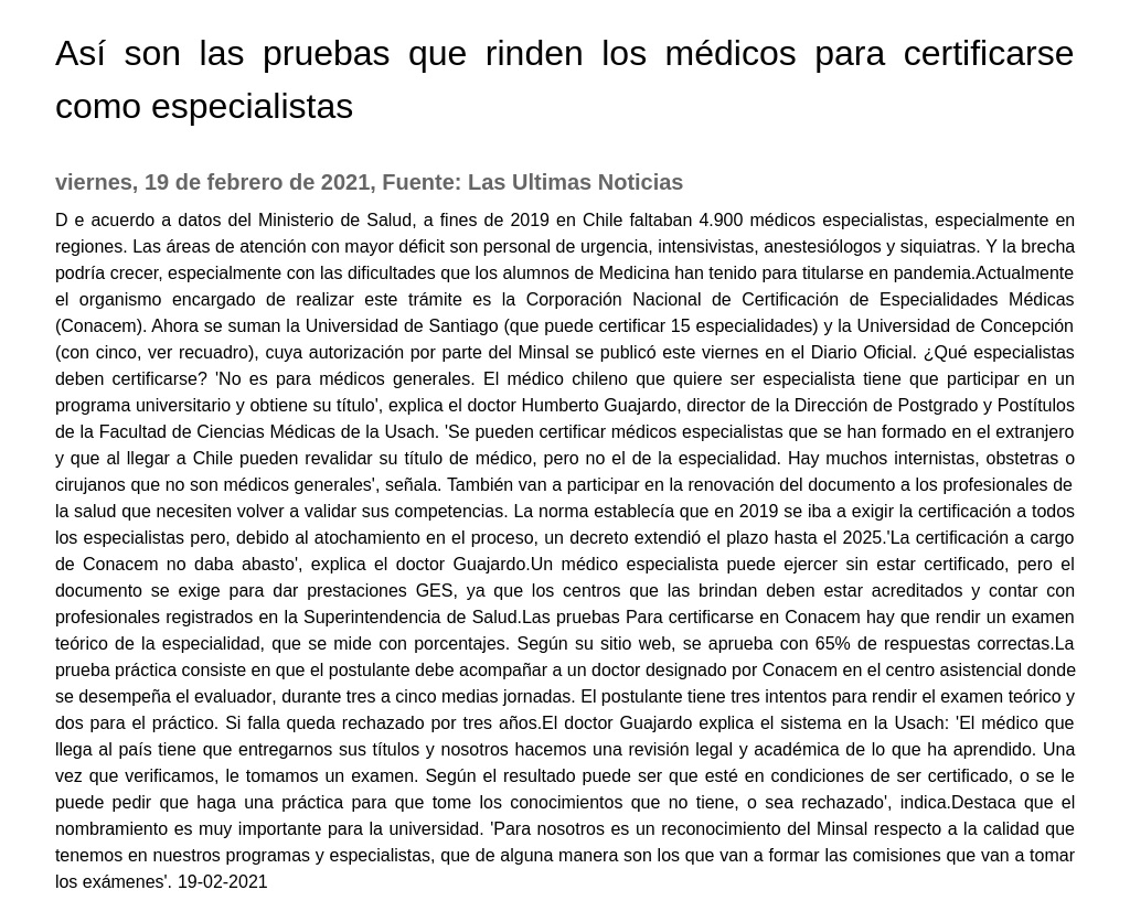 Un médico especialista puede ejercer sin estar certificado, pero el documento se exige para dar prestaciones GES, ya que los centros que las brindan deben estar acreditados y contar con profesionales registrados en la Superintendencia de Salud. Las pruebas Para certificarse en Conacem hay que rendir un examen teórico de la especialidad, que se mide con porcentajes. Según su sitio web, se aprueba con 65% de respuestas correctas. La prueba práctica consiste en que el postulante debe acompañar a un doctor designado por Conacem en el centro asistencial donde se desempeña el evaluador, durante tres a cinco medias jornadas. El postulante tiene tres intentos para rendir el examen teórico y dos para el práctico. Si falla queda rechazado por tres años. El doctor Guajardo explica el sistema en la Usach: "El médico que llega al país tiene que entregarnos sus títulos y nosotros hacemos una revisión legal y académica de lo que ha aprendido. Una vez que verificamos, le tomamos un examen. Según el resultado puede ser que esté en condiciones de ser certificado, o se le puede pedir que haga una práctica para que tome los conocimientos que no tiene, o sea rechazado", indica.