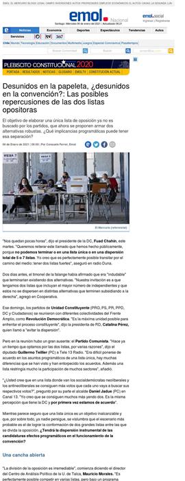 El problema de la oposición es que esta división en varias listas no responde a una decisión estratégica, sino que a diferencias de fondo que ””hoy por hoy”” parecen insuperables" Mauricio Morales Para la académica del Instituto de Asuntos Públicos de la U. de Chile, Mireya Dávila, nada está escrito en piedra. "La posibilidad de una convergencia programática dependerá de cómo quede configurada la asamblea y de la existencia de liderazgos individuales o grupales aptos para aunar criterios, mínimos aceptables y estrategias procedimentales", opina.