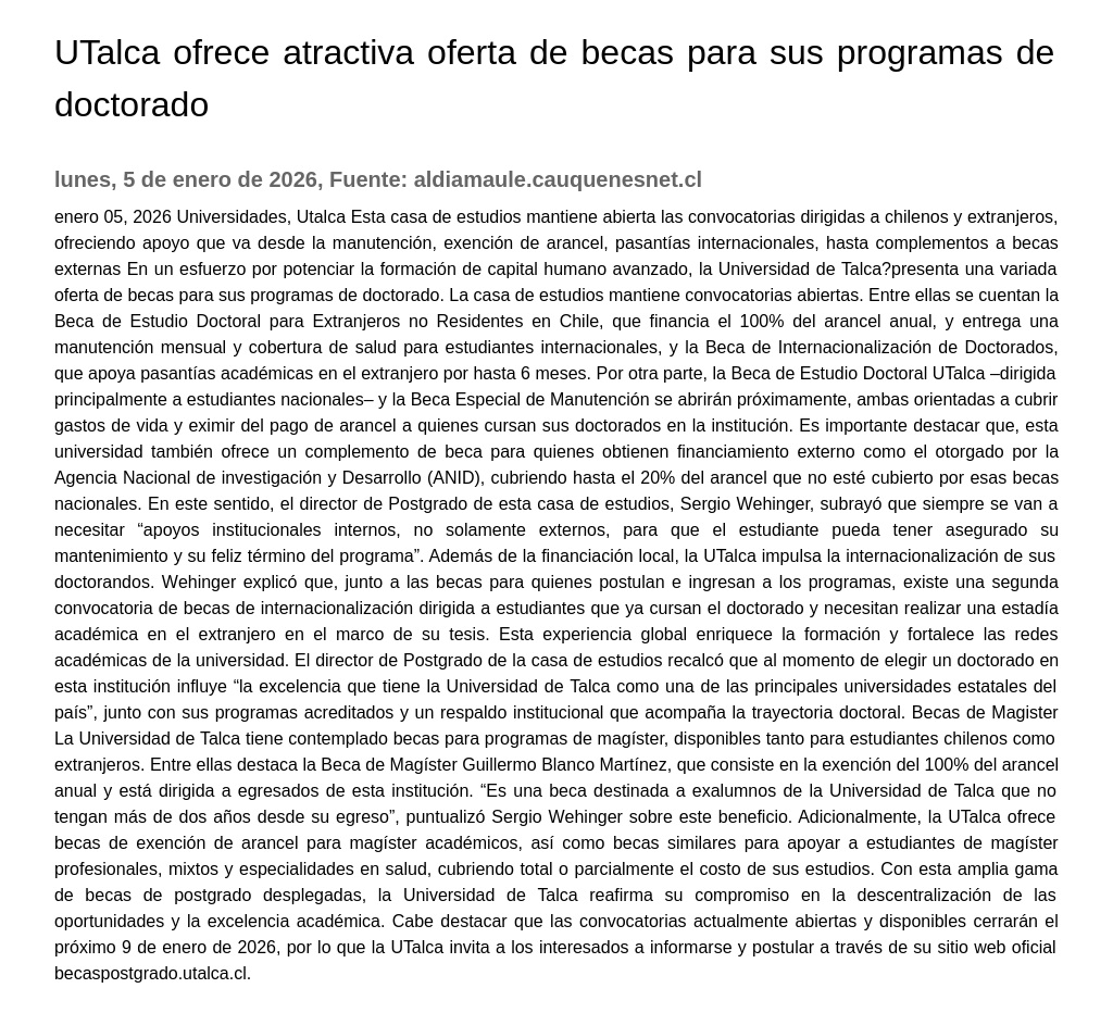 Universidad de Talca como una de las principales universidades estatales del país”, junto con sus programas acreditados y un respaldo institucional que acompaña la trayectoria doctoral. Becas de Magister La