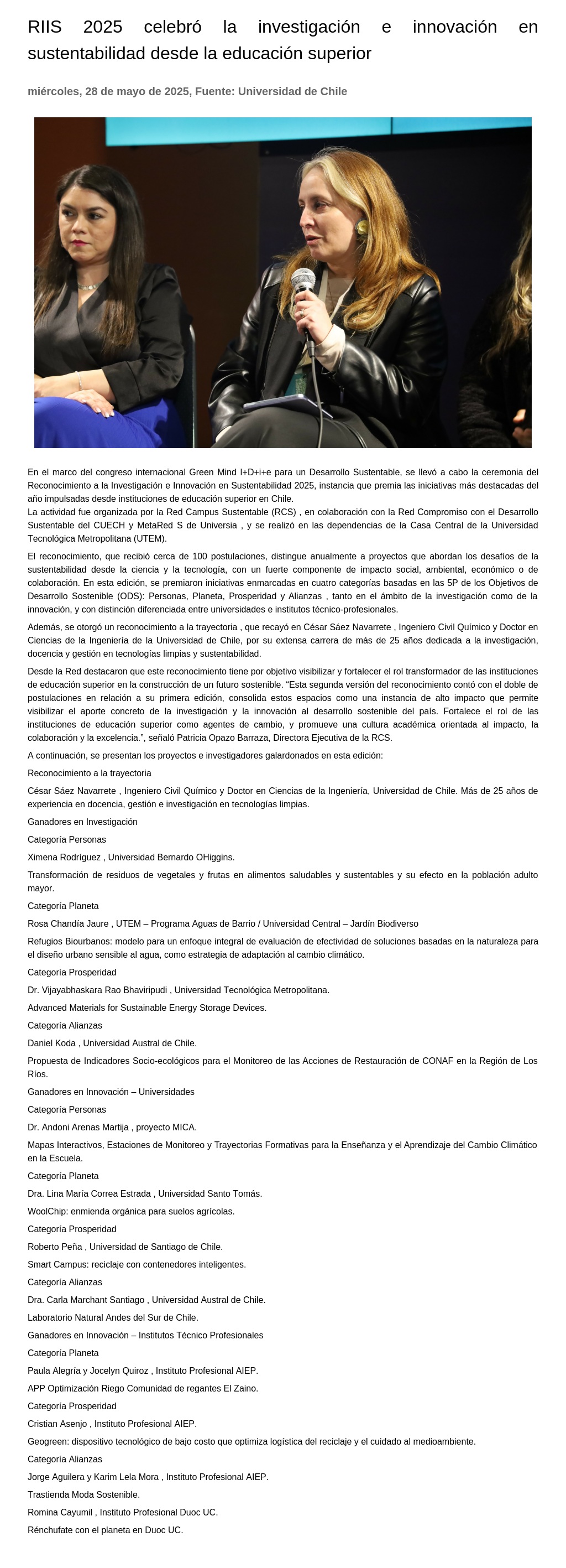 RIIS 2025 celebró la investigación e innovación en sustentabilidad desde la educación superior 28-05-2025 Universidad de Chile En el marco del congreso internacional Green Mind I+D+i+e para un Desarrollo Sustentable, se llevó a cabo la ceremonia del Reconocimiento a la Investigación e Innovación en Sustentabilidad 2025, in... |