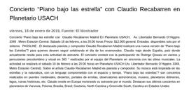Concierto “Piano bajo las estrella” con Claudio Recabarren en Planetario USACH 18-01-2019 El Mostrador Concierto "Piano bajo las estrella" con Claudio Recabarren Madrid En Planetario USACH, Av. Libertador Bernardo O`Higgins 3349. Metro Estación Central. Sábado 16 de febrero, a las 20:00 hora... |
