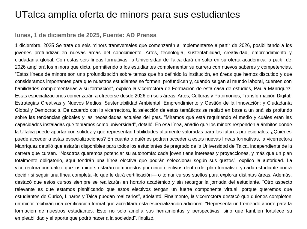 La vicerrectora puntualizó que los minors estarán compuestos por cinco electivos dentro del plan formativo, y cada estudiante podrá decidir si seguir una línea completa -lo que le dará certificación— o tomar cursos sueltos para explorar distintas áreas. Además, destacó que estos cursos siempre se realizarán en horario académico y sin recargar la jornada del estudiante. “Otro aspecto relevante es que estamos planificando que estos electivos tengan un fuerte componente virtual, porque queremos que estudiantes de Curicó, Linares y Talca puedan realizarlos”, adelantó. Finalmente, la vicerrectora destacó que quienes completen un minor recibirán una certificación formal que acreditará esta especialización adicional. “Representa un tremendo aporte para la formación de nuestros estudiantes. Esto no solo amplía sus herramientas y perspectivas, sino que también fortalece su empleabilidad y el aporte que podrá hacer a la sociedad”, finalizó. Fuente: U. Talca.