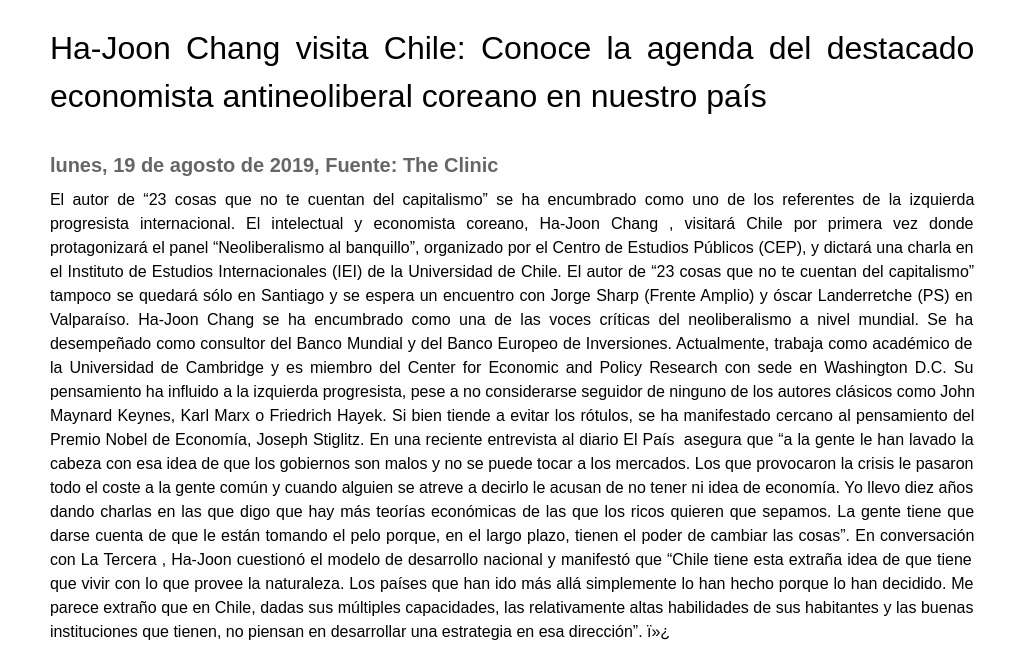 La gente tiene que darse cuenta de que le están tomando el pelo porque, en el largo plazo, tienen el poder de cambiar las cosas”. En conversación con La Tercera, Ha-Joon cuestionó el modelo de desarrollo nacional y manifestó que “Chile tiene esta extraña idea de que tiene que vivir con lo que provee la naturaleza. Los países que han ido más allá simplemente lo han hecho porque lo han decidido. Me parece extraño que en Chile, dadas sus múltiples capacidades, las relativamente altas habilidades de sus habitantes y las buenas instituciones que tienen, no piensan en desarrollar una estrategia en esa dirección”.