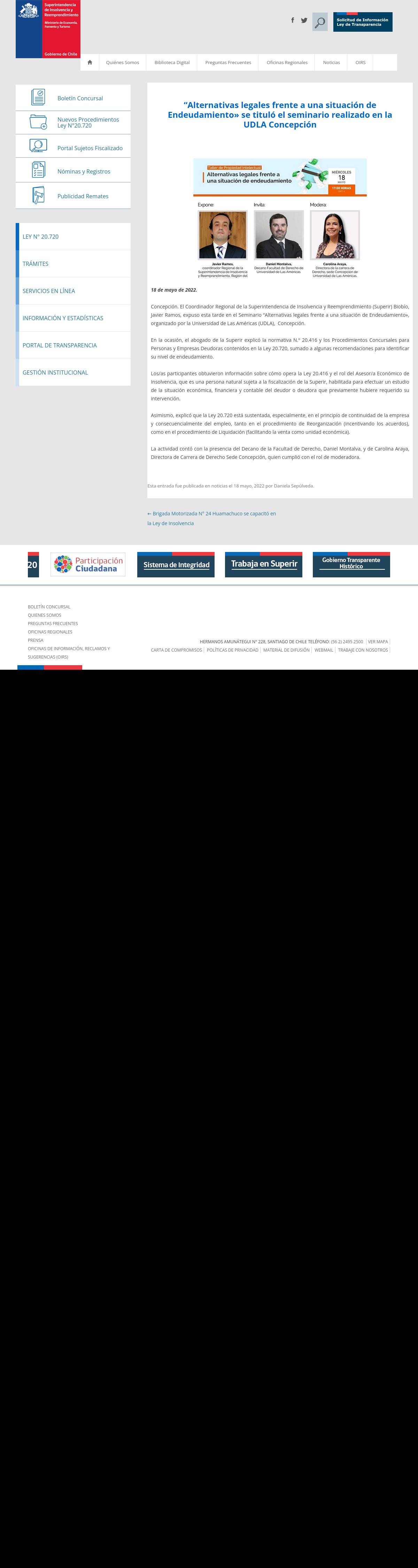 El Coordinador Regional de la Superintendencia de Insolvencia y Reemprendimiento (Superir) Biobío, Javier Ramos, expuso esta tarde en el Seminario “Alternativas legales frente a una situación de Endeudamiento», organizado por la