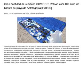 Operativo de limpieza. Cerca de 400 kilos de basura se retiraron el domingo desde Playa Llacolén de Antofagasta, dentro de los cuales se encontraban en su mayoría mascarillas, colillas de cigarros y botellas de cerveza. El seremi de Medio Ambiente, Gonzalo Bravo, comentó sobre el operativo que “ los residuos COVID son muchos y se demoran mucho en degradar ”, haciendo a la vez un llamado a tomar conciencia y a poder colaborar respecto a la eliminación de nuestros desechos. Vecinos del sector, voluntarios, estudiantes y diferentes instituciones y organizaciones participaron en el operativo efectuado en el marco del Día Internacional de la Limpieza de Playas. La actividad desarrollada por el Círculo de Seguridad y Protección de la Bahía contó con la presencia de la Armada de Chile, Sernapesca, Cuarta Compañía de Bomberos de Antofagasta, Suatrans, Remm Emergencias, Fundación Desierto Azul, Fundación Fluye, ATI Puerto Antofagasta, Liceo Andrés Sabella, Empresa Intersales, Fundación Humboldti, Rotary Caliche, Vitrina Norte y Santo Tomás, entre otros. Imágenes: Cedidas. Galería Imágenes|