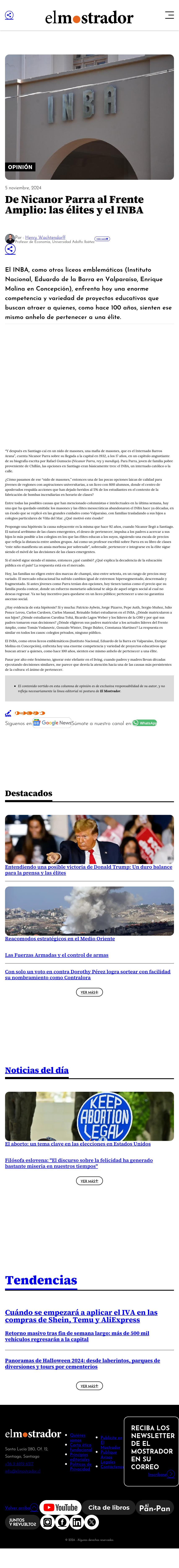 De Nicanor Parra al Frente Amplio: las élites y el INBA 05-11-2024 El Mostrador Por : Henry Wachtendorff Profesor de Economía, Universidad Adolfo Ibáñez El INBA, como otros liceos emblemáticos (Instituto Nacional, Eduardo de la Barra en Valparaíso, Enrique Molina en Conc... |