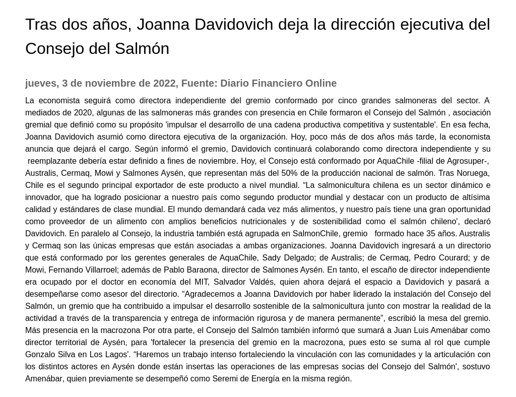 Tras dos años, Joanna Davidovich deja la dirección ejecutiva del Consejo del Salmón 03-11-2022 Diario Financiero Online La economista seguirá como directora independiente del gremio conformado por cinco grandes salmoneras del sector. A mediados de 2020, algunas de las salmoneras más grandes con presencia en Chile ... |