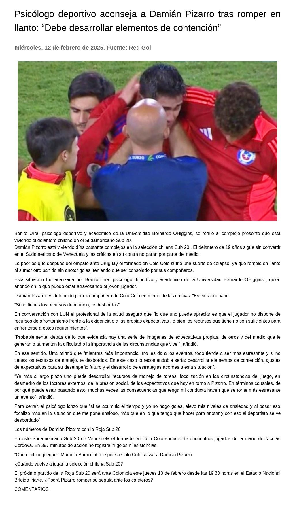 Psicólogo deportivo aconseja a Damián Pizarro tras romper en llanto: “Debe desarrollar elementos de contención” 12-02-2025 Red Gol Benito Urra, psicólogo deportivo y académico de la Universidad Bernardo OHiggins, se refirió al complejo presente que está viviendo el delantero chileno en el Sudamericano Sub 20. Damián Pizar... |
