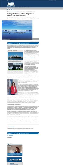 De esta forma, la asociación gremial ”“conformada a mediados de 2020 e integrada por las empresas AquaChile, Cermaq, Mowi y Salmones Aysén”“, dio a conocer su “Programa de Cumplimiento de la normativa de libre competencia” y el “Código de Ética y Buenas Prácticas”, los que se encuentran disponibles en el sitio web http://www.consejodelsalmon.cl/. El “Programa de Cumplimiento de la normativa de libre competencia” establece los protocolos, procedimientos, auditorías y canales de denuncias para evitar eventuales actos que puedan representar una infracción en materia de libre competencia.