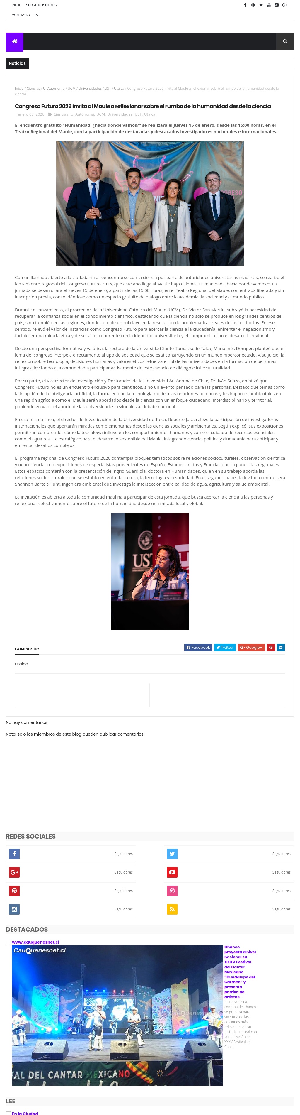 Con un llamado abierto a la ciudadanía a reencontrarse con la ciencia por parte de autoridades universitarias maulinas, se realizó el lanzamiento regional del Congreso Futuro 2026, que este año llega al Maule bajo el lema “Humanidad, ¿hacia dónde vamos?”. La jornada se desarrollará el jueves 15 de enero, a partir de las 15:00 horas, en el Teatro Regional del Maule, con entrada liberada y sin inscripción previa, consolidándose como un espacio gratuito de diálogo entre la academia, la sociedad y el mundo público. Durante el lanzamiento, el prorrector de la Universidad Católica del Maule (UCM), Dr.