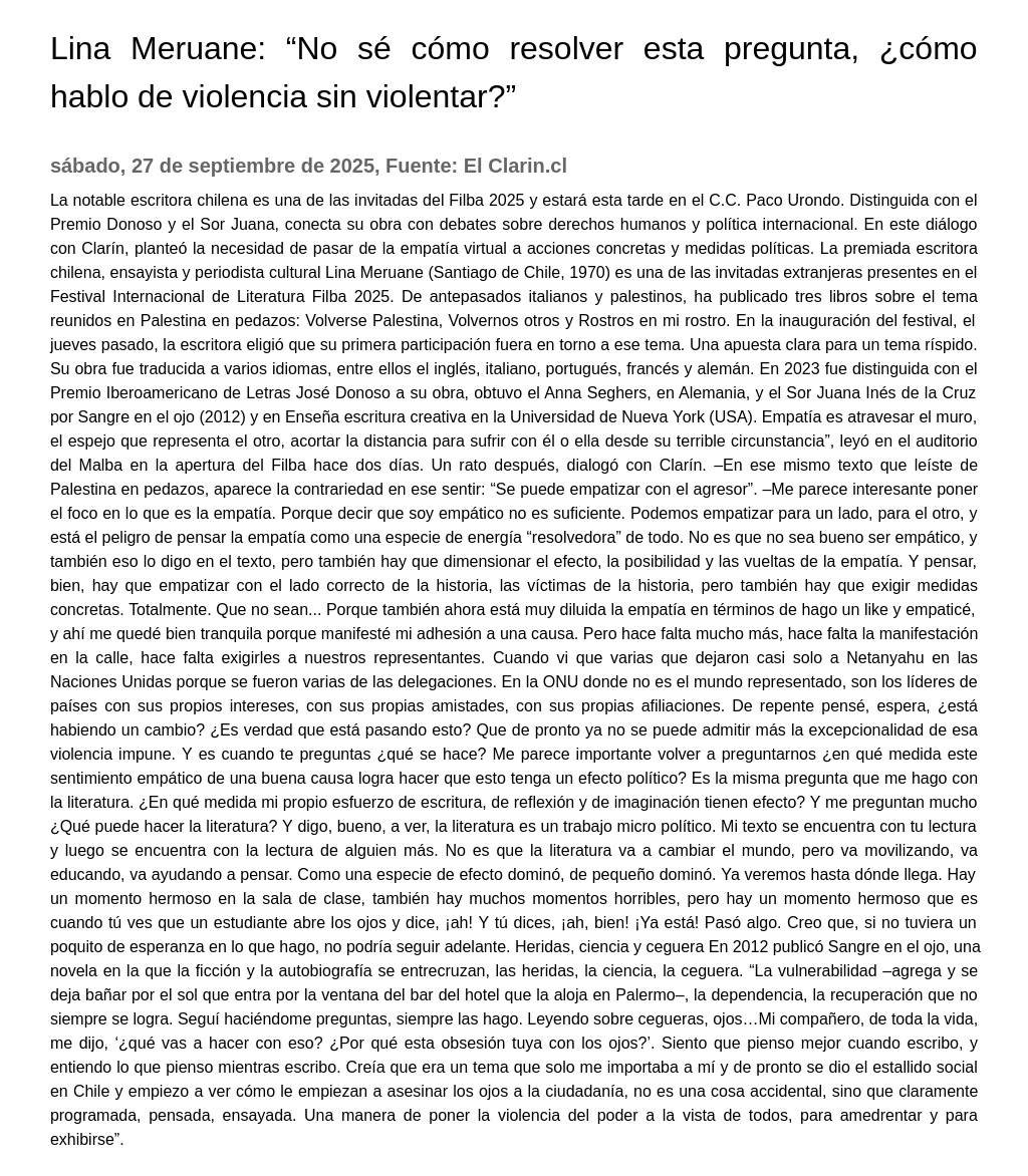 La notable escritora chilena es una de las invitadas del Filba 2025 y estará esta tarde en el C.C. Paco Urondo. Distinguida con el Premio Donoso y el Sor Juana, conecta su obra con debates sobre derechos humanos y política internacional. En este diálogo con Clarín, planteó la necesidad de pasar de la empatía virtual a acciones concretas y medidas políticas. La premiada escritora chilena, ensayista y periodista cultural Lina Meruane (Santiago de Chile, 1970) es una de las invitadas extranjeras presentes en el Festival Internacional de Literatura Filba 2025. De antepasados italianos y palestinos, ha publicado tres libros sobre el tema reunidos en Palestina en pedazos: Volverse Palestina, Volvernos otros y Rostros en mi rostro. En la inauguración del festival, el jueves pasado, la escritora eligió que su primera participación fuera en torno a ese tema. Una apuesta clara para un tema ríspido. Su obra fue traducida a varios idiomas, entre ellos el inglés, italiano, portugués, francés y alemán.