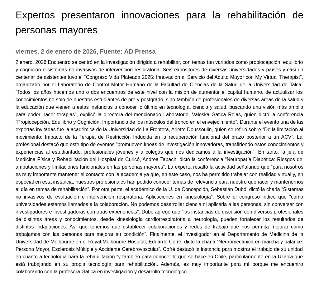UTalca que está trabajando en su propia tecnología para rehabilitación. Además, es muy importante para mí porque me encuentro colaborando con la profesora Gatica en investigación y desarrollo tecnológico”.