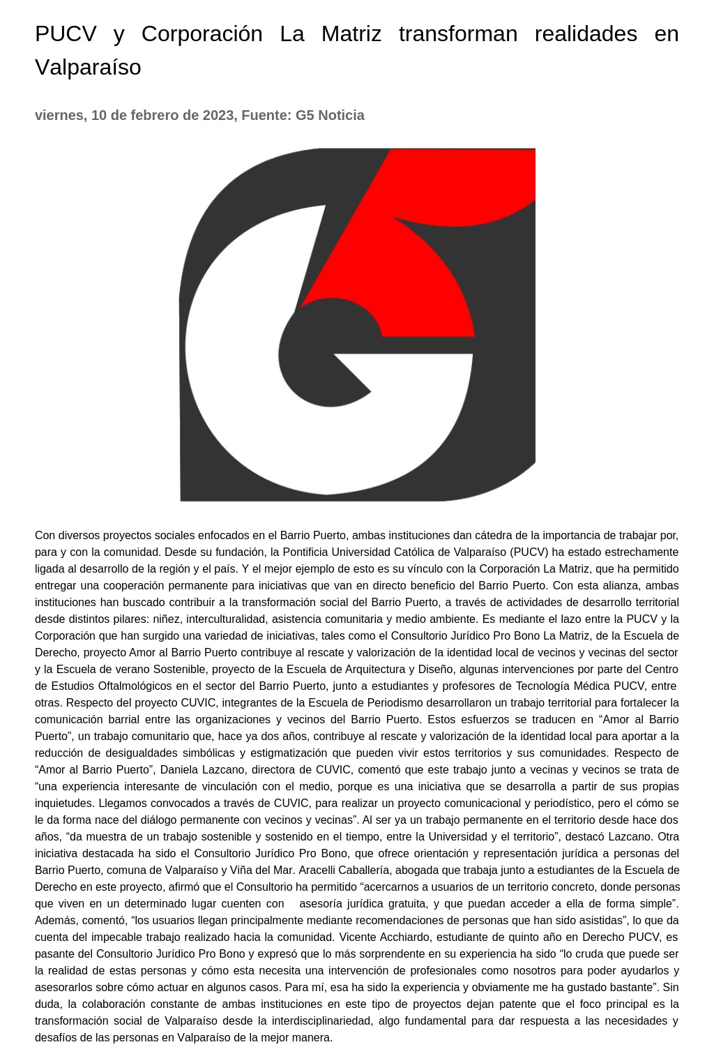 PUCV) ha estado estrechamente ligada al desarrollo de la región y el país. Y el mejor ejemplo de esto es su vínculo con la Corporación La Matriz, que ha permitido entregar una cooperación permanente para iniciativas que van en directo beneficio del Barrio Puerto. Con esta alianza, ambas instituciones han buscado contribuir a la transformación social del Barrio Puerto, a través de actividades de desarrollo territorial desde distintos pilares: niñez, interculturalidad, asistencia comunitaria y medio ambiente.