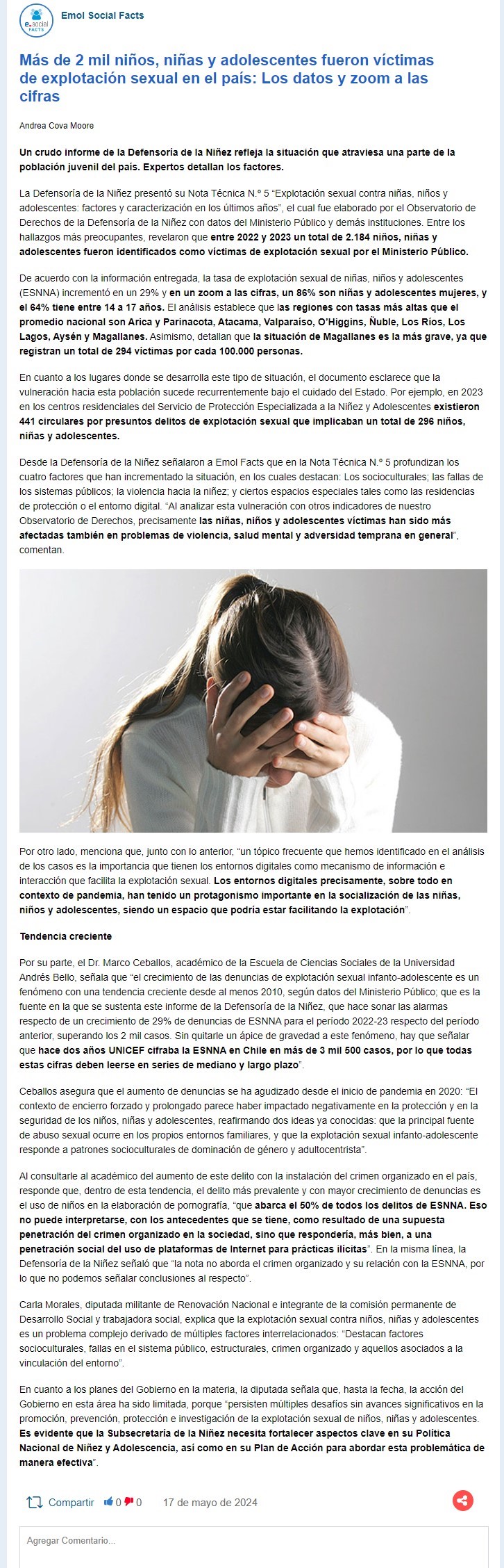 Eso no puede interpretarse, con los antecedentes que se tiene, como resultado de una supuesta penetración del crimen organizado en la sociedad, sino que respondería, más bien, a una penetración social del uso de plataformas de Internet para prácticas ilícitas”. En la misma línea, la Defensoría de la Niñez señaló que “la nota no aborda el crimen organizado y su relación con la ESNNA, por lo que no podemos señalar conclusiones al respecto”. Carla Morales, diputada militante de Renovación Nacional e integrante de la comisión permanente de Desarrollo Social y trabajadora social, explica que la explotación sexual contra niños, niñas y adolescentes es un problema complejo derivado de múltiples factores interrelacionados: “Destacan factores socioculturales, fallas en el sistema público, estructurales, crimen organizado y aquellos asociados a la vinculación del entorno”. En cuanto a los planes del Gobierno en la materia, la diputada señala que, hasta la fecha, la acción del Gobierno en esta área ha sido limitada, porque “persisten múltiples desafíos sin avances significativos en la promoción, prevención, protección e investigación de la explotación sexual de niños, niñas y adolescentes. Es evidente que la Subsecretaría de la Niñez necesita fortalecer aspectos clave en su Política Nacional de Niñez y Adolescencia, así como en su Plan de Acción para abordar esta problemática de manera efectiva”.
