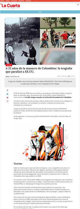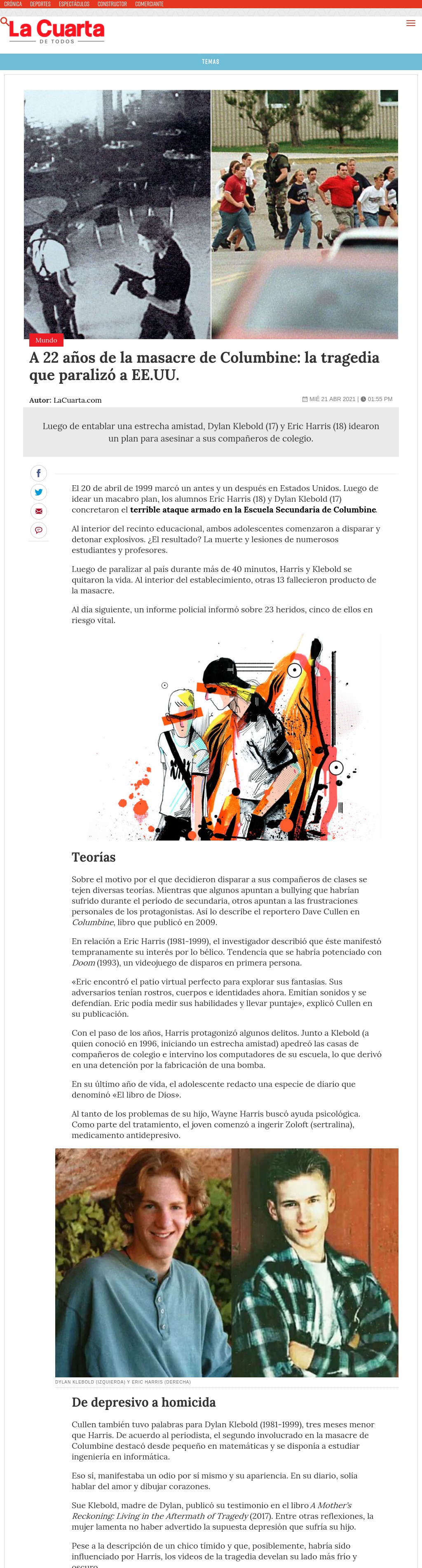 A 22 años de la masacre de Columbine: la tragedia que paralizó a EE.UU. 21-04-2021 La Cuarta Luego de entablar una estrecha amistad, Dylan Klebold (17) y Eric Harris (18) idearon un plan para asesinar a sus compañeros de colegio. El 20 de abril de 1999 marcó un antes y un después en Estad... |
