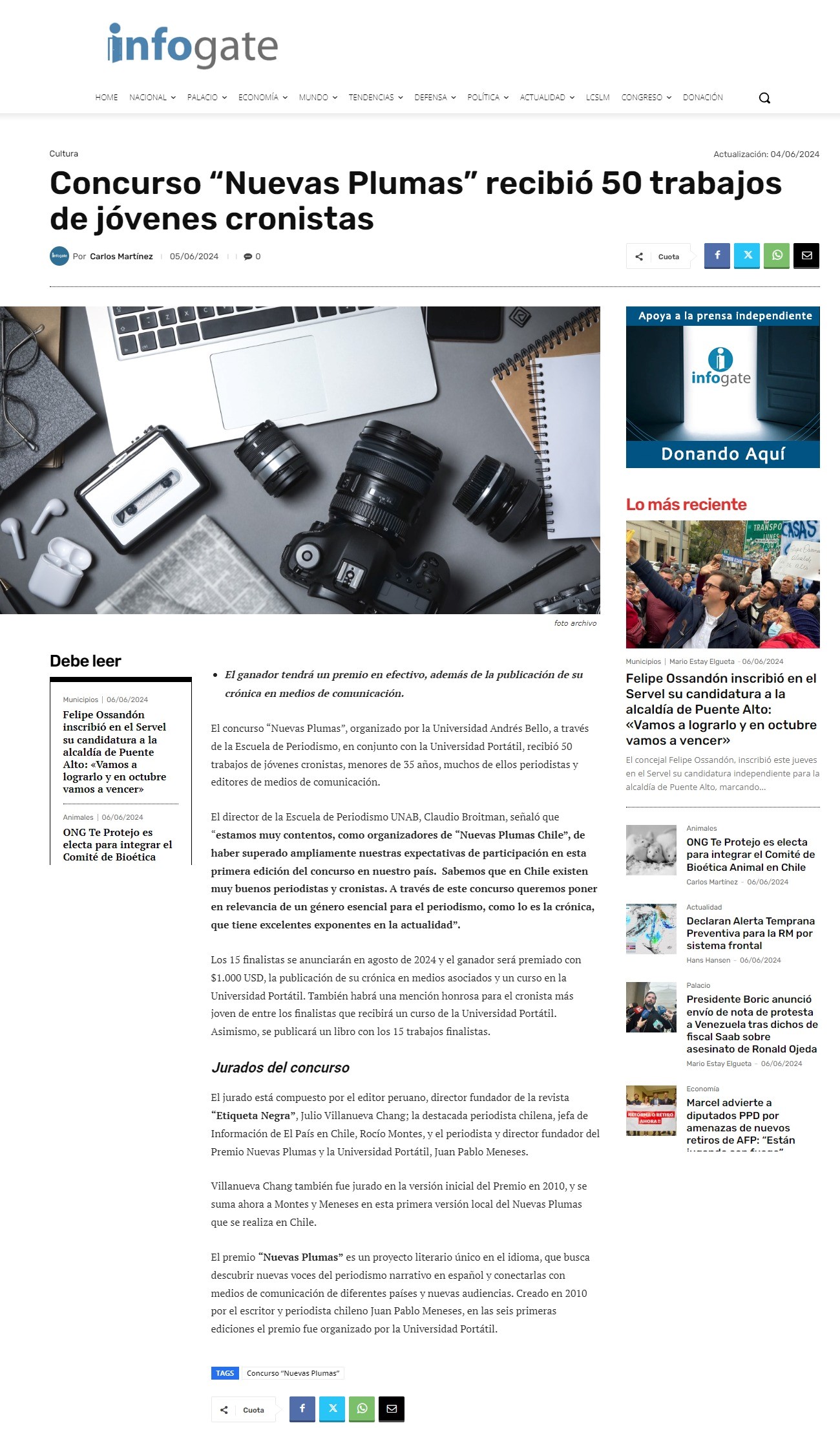 Jurados del concurso El jurado está compuesto por el editor peruano, director fundador de la revista “Etiqueta Negra”, Julio Villanueva Chang; la destacada periodista chilena, jefa de Información de El País en Chile, Rocío Montes, y el periodista y director fundador del Premio Nuevas Plumas y la Universidad Portátil, Juan Pablo Meneses. Villanueva Chang también fue jurado en la versión inicial del Premio en 2010, y se suma ahora a Montes y Meneses en esta primera versión local del Nuevas Plumas que se realiza en Chile. El premio “Nuevas Plumas” es un proyecto literario único en el idioma, que busca descubrir nuevas voces del periodismo narrativo en español y conectarlas con medios de comunicación de diferentes países y nuevas audiencias. Creado en 2010 por el escritor y periodista chileno Juan Pablo Meneses, en las seis primeras ediciones el premio fue organizado por la Universidad Portátil.