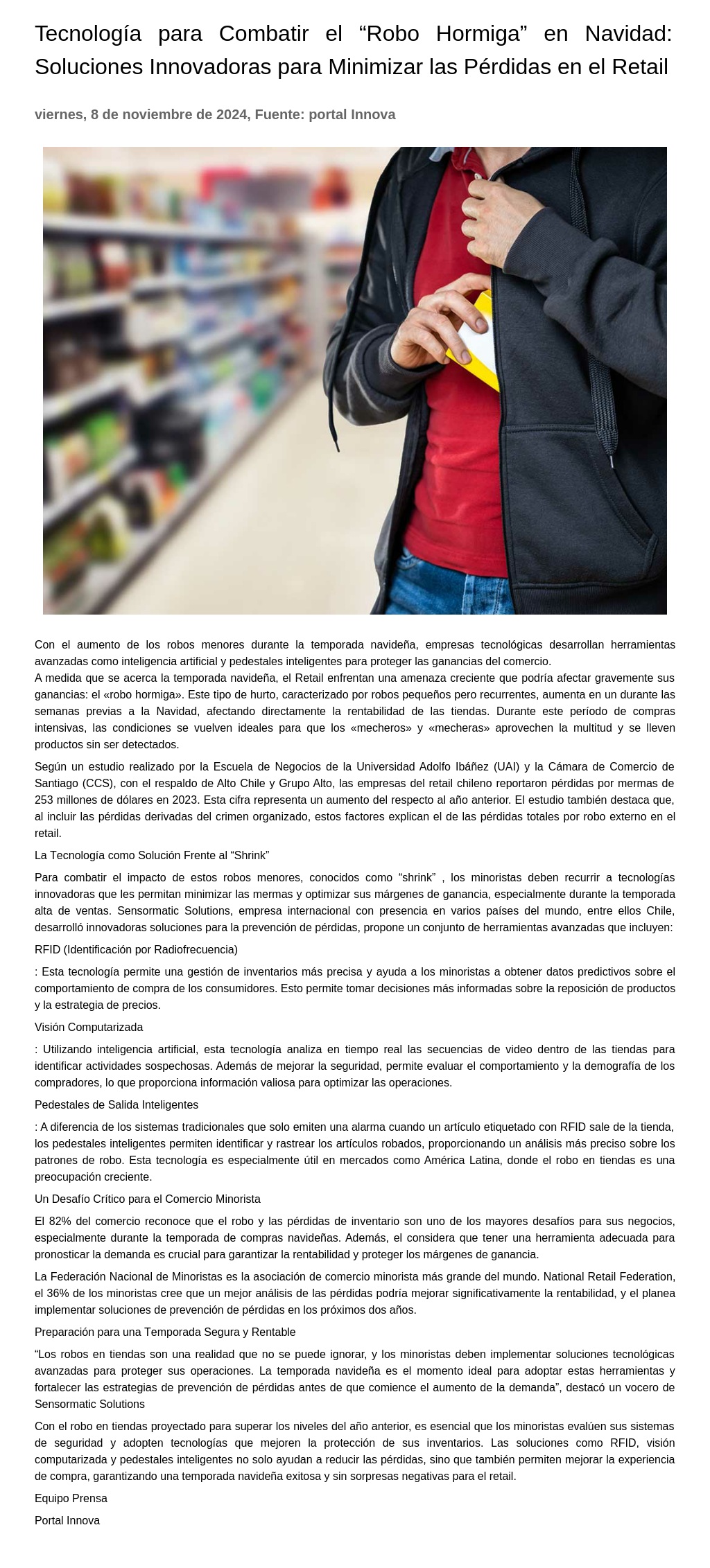 Tecnología para Combatir el “Robo Hormiga” en Navidad: Soluciones Innovadoras para Minimizar las Pérdidas en el Retail 08-11-2024 portal Innova Con el aumento de los robos menores durante la temporada navideña, empresas tecnológicas desarrollan herramientas avanzadas como inteligencia artificial y pedestales inteligentes para proteger las g... |