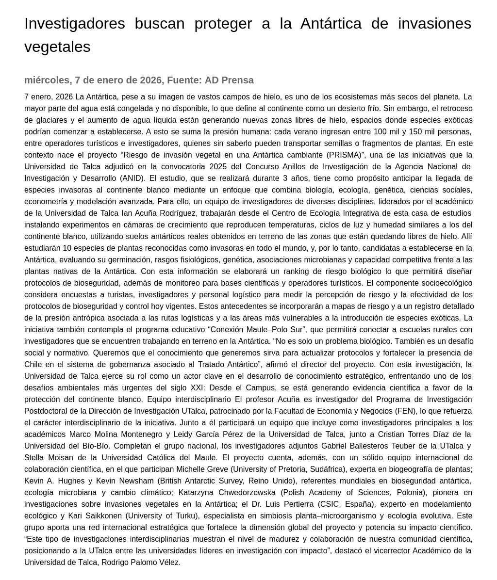 Allí estudiarán 10 especies de plantas reconocidas como invasoras en todo el mundo, y, por lo tanto, candidatas a establecerse en la Antártica, evaluando su germinación, rasgos fisiológicos, genética, asociaciones microbianas y capacidad competitiva frente a las plantas nativas de la Antártica. Con esta información se elaborará un ranking de riesgo biológico lo que permitirá diseñar protocolos de bioseguridad, además de monitoreo para bases científicas y operadores turísticos. El componente socioecológico considera encuestas a turistas, investigadores y personal logístico para medir la percepción de riesgo y la efectividad de los protocolos de bioseguridad y control hoy vigentes. Estos antecedentes se incorporarán a mapas de riesgo y a un registro detallado de la presión antrópica asociada a las rutas logísticas y a las áreas más vulnerables a la introducción de especies exóticas. La iniciativa también contempla el programa educativo “Conexión Maule–Polo Sur”, que permitirá conectar a escuelas rurales con investigadores que se encuentren trabajando en terreno en la Antártica. “No es solo un problema biológico. También es un desafío social y normativo. Queremos que el conocimiento que generemos sirva para actualizar protocolos y fortalecer la presencia de Chile en el sistema de gobernanza asociado al Tratado Antártico”, afirmó el director del proyecto.