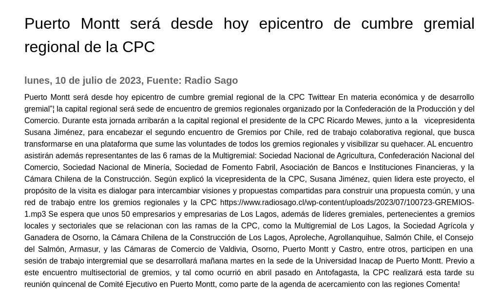 Puerto Montt será desde hoy epicentro de cumbre gremial regional de la CPC Twittear En materia económica y de desarrollo gremial”¦ la capital regional será sede de encuentro de gremios regionales organizado por la Confederación de la Producción y del Comercio., Durante esta jornada arribarán a la capital regional el presidente de la CPC Ricardo Mewes, junto a la vicepresidenta Susana Jiménez, para encabezar el segundo encuentro de Gremios por Chile, red de trabajo colaborativa regional, que busca transformarse en una plataforma que sume las voluntades de todos los gremios regionales y visibilizar su quehacer., Según explicó la vicepresidenta de la CPC, Susana Jiménez, quien lidera este proyecto, el propósito de la visita es dialogar para intercambiar visiones y propuestas compartidas para construir una propuesta común, y una red de trabajo entre los gremios regionales y la CPC https://www.radiosago.cl/wp-content/uploads/2023/07/100723-GREMIOS-1.mp3 Se espera que unos 50 empresarios y empresarias de Los Lagos, además de líderes gremiales, pertenecientes a gremios locales y sectoriales que se relacionan con las ramas de la CPC, como la Multigremial de Los Lagos, la Sociedad Agrícola y Ganadera de Osorno, la Cámara Chilena de la Construcción de Los Lagos, Aproleche, Agrollanquihue, Salmón Chile, el Consejo del Salmón, Armasur, y las Cámaras de Comercio de Valdivia, Osorno, Puerto Montt y Castro, entre otros, participen en una sesión de trabajo intergremial que se desarrollará mañana martes en la sede de la Universidad Inacap de Puerto Montt.