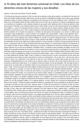 El aumento de las representantes en las cámaras de diputados y senadores es reciente y tardío, en comparación con otros países del mundo y la región" Kathya Araujo, académica del Instituto de Estudios Avanzados de la Usach Añadió que "esta es una barrera cultural que todavía hay que modificar, pero que se hará en la medida en que las mujeres tengamos posibilidades de ejercitar esa capacidad de liderazgo y conducción; y que las nuevas generaciones crezcan con referencias de ambos sexos en todos los planos de la vida". Para Kathya Araujo, académica del Instituto de Estudios Avanzados Universidad de Santiago, el trabajo más difícil de de estos tiempos "es el derecho a ejercer cargos de representación política ". "Me parece que ha sido una lucha bastante trabajosa y que ha empezado a tener réditos recién ahora. El aumento de las representantes en las cámaras de diputados y senadores es reciente y tardío, en comparación con otros países del mundo y la región. Creo eso ha sido positivo y muy importante en términos institucionales. El cambio del sistema binominal también ha sido favorable para las mujeres, porque amplía la posibilidad de representación de otros grupos”?, finalizó