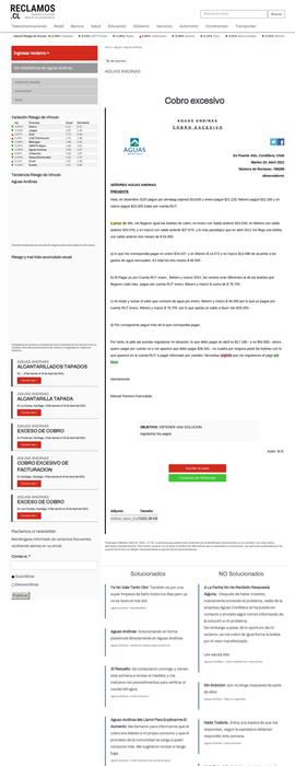 Aguas Cordillera - Cobro indebido por mala lectura Sin Solucion : aún no tengo respuesta de parte de ellos Aguas Andinas - Pago no registrado Nada Todavía. : Estoy a la espera de que me respondan, segun la operadora deberian responder esta semana. Aguas Andinas - cobro excesivo Negativo : Al fin de todo, pagué la cuenta. Ya que quedaron de llamarme y darme respuesta en 7 días hábiles. Ya van 10 y todavía no tengo noticias. Y la verdad es que yo siempre pago al día no quise atrasarme porque ésto se me iba a acumular. Me siento estafada.
