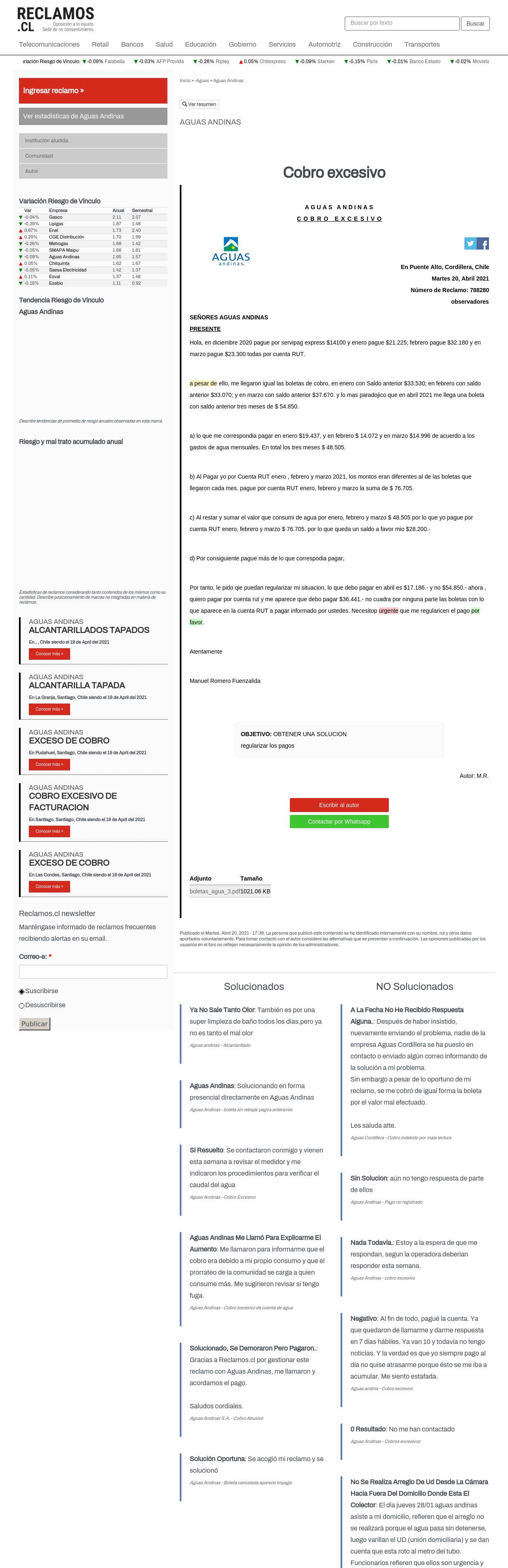 Aguas andina - Cobro excesivo 0 Resultado : No me han contactado Aguas Andinas - Cobros excesivos No Se Realiza Arreglo De Ud Desde La Cámara Hacia Fuera Del Domicilio Donde Esta El Colector : El día jueves 28/01 aguas andinas asiste a mi domicilio, refieren que el arreglo no se realizará porque el agua pasa sin detenerse, luego varillan el UD (unión domiciliaria) y se dan cuenta que esta roto al metro del tubo. Funcionarios refieren que ellos son urgencia y que no hacen ese trabajo. Comentan a ese trabajo cuesta $3.000.000 de pesos que será cobrado por aguas andinas, y que ellos lo pueden realizar por $300.000 pesos. He estado averiguando con la superintendencia y tengo entendido que cualquier arreglo desde la cámara hacia afuera del domicilio corresponde a aguas andinas. No entiendo por que los funcionarios de aguas andinas refieren que lo debemos pagar, si es responsabilidad de la empresa. La verdad que estoy muy decepcionada de la empresa, se ha entregado un muy mal servicio desde el 04/01. Entregan información falta, no cumplen, no saben los protocolos, no contactan al cliente, etc. Aguas Andinas - Demora en reparación de cámara de agua tapada Evite Por gestión de sus reclamos, evite y prefiera. Sugerencia basada en la experiencia de 25 clientes de estas empresas, encuestados por reclamos. cl tiempo después de publicar su reclamo. Ver más comparaciones.
