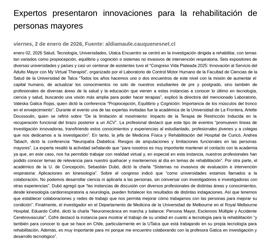 Así que tenemos que establecer colaboraciones y redes de trabajo que nos permita mejorar cómo trabajamos con las personas para mejorar su condición”. Finalmente, el investigador en el Departamento de Medicina de la Universidad de Melbourne en el Royal Melbourne Hospital, Eduardo Cofré, dictó la charla “Neuromecánica en marcha y balance: Persona Mayor, Esclerosis Múltiple y Accidente Cerebrovascular”. Cofré destacó la instancia para mostrar el trabajo de su unidad en cuanto a tecnología para la rehabilitación “y también para conocer lo que se hace en Chile, particularmente en la