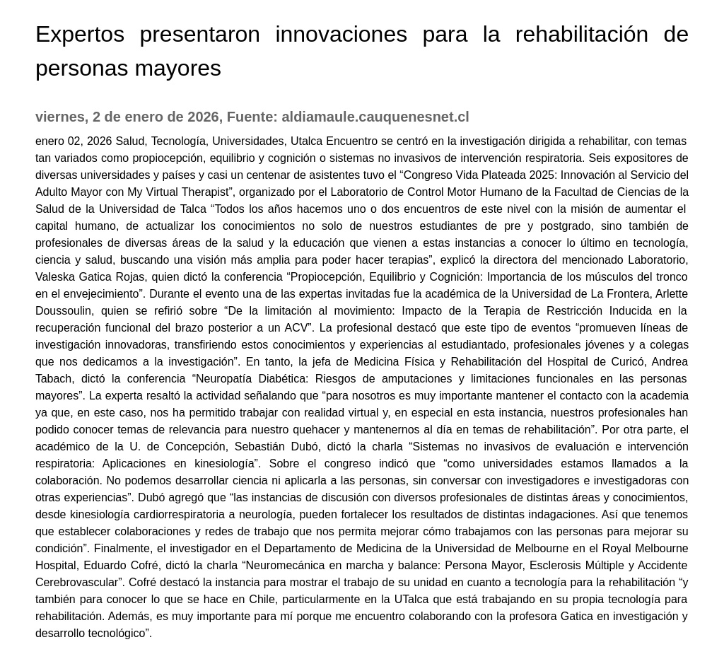 Universidad de Talca “Todos los años hacemos uno o dos encuentros de este nivel con la misión de aumentar el capital humano, de actualizar los conocimientos no solo de nuestros estudiantes de pre y postgrado, sino también de profesionales de diversas áreas de la salud y la educación que vienen a estas instancias a conocer lo último en tecnología, ciencia y salud, buscando una visión más amplia para poder hacer terapias”, explicó la directora del mencionado Laboratorio, Valeska Gatica Rojas, quien dictó la conferencia “Propiocepción, Equilibrio y Cognición: Importancia de los músculos del tronco en el envejecimiento”. Durante el evento una de las expertas invitadas fue la académica de la Universidad de La Frontera, Arlette Doussoulin, quien se refirió sobre “De la limitación al movimiento: Impacto de la Terapia de Restricción Inducida en la recuperación funcional del brazo posterior a un ACV”. La profesional destacó que este tipo de eventos “promueven líneas de investigación innovadoras, transfiriendo estos conocimientos y experiencias al estudiantado, profesionales jóvenes y a colegas que nos dedicamos a la investigación”. En tanto, la jefa de Medicina Física y Rehabilitación del Hospital de Curicó, Andrea Tabach, dictó la conferencia “Neuropatía Diabética: Riesgos de amputaciones y limitaciones funcionales en las personas mayores”. La experta resaltó la actividad señalando que “para nosotros es muy importante mantener el contacto con la academia ya que, en este caso, nos ha permitido trabajar con realidad virtual y, en especial en esta instancia, nuestros profesionales han podido conocer temas de relevancia para nuestro quehacer y mantenernos al día en temas de rehabilitación”. Por otra parte, el académico de la U. de Concepción, Sebastián Dubó, dictó la charla “Sistemas no invasivos de evaluación e intervención respiratoria: Aplicaciones en kinesiología”. Sobre el congreso indicó que “como universidades estamos llamados a la colaboración.