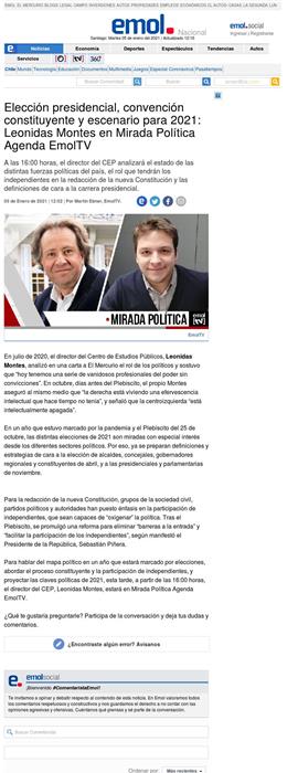 Para hablar del mapa político en un año que estará marcado por elecciones, abordar el proceso constituyente y la participación de independientes, y proyectar las claves políticas de 2021, esta tarde, a partir de las 16:00 horas, el director del CEP, Leonidas Montes, estará en Mirada Política Agenda EmolTV. ¿Qué te gustaría preguntarle? Participa de la conversación y deja tus dudas y comentarios.
