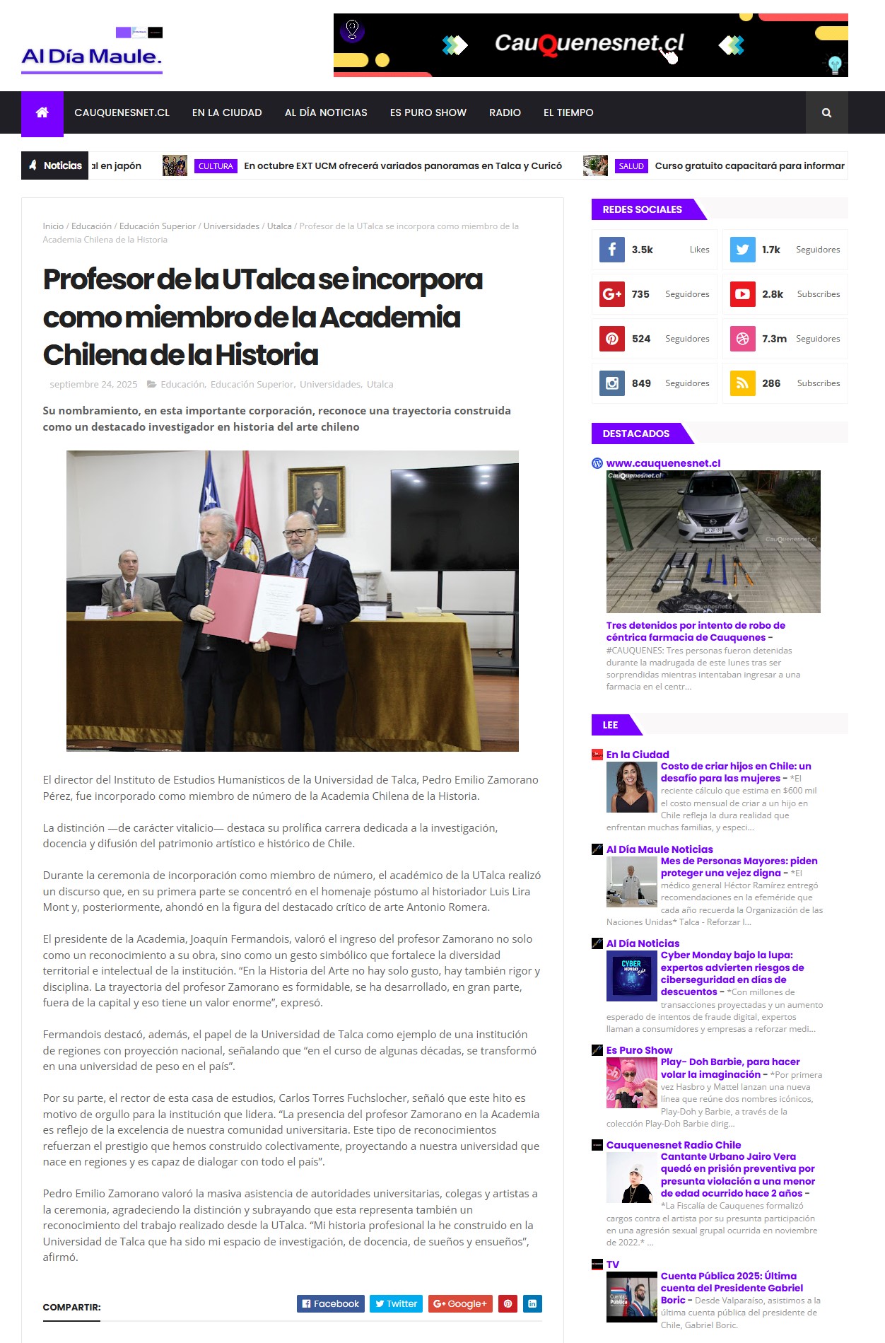 Universidad de Talca, Pedro Emilio Zamorano Pérez, fue incorporado como miembro de número de la Academia Chilena de la Historia. La distinción —de carácter vitalicio— destaca su prolífica carrera dedicada a la investigación, docencia y difusión del patrimonio artístico e histórico de Chile.