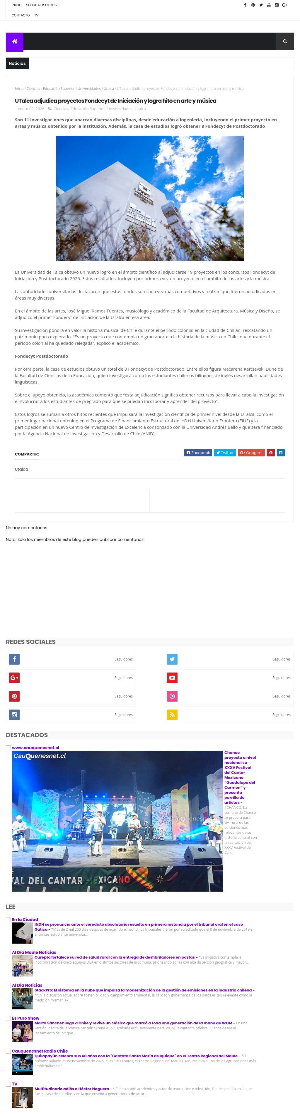 Universidad de Talca obtuvo un nuevo logro en el ámbito científico al adjudicarse 19 proyectos en los concursos Fondecyt de Iniciación y Postdoctorado 2026. Estos resultados, incluyen por primera vez un proyecto en el ámbito de las artes y la música. Las autoridades universitarias destacaron que estos fondos son cada vez más competitivos y realzan que fueron adjudicados en áreas muy diversas. En el ámbito de las artes, José Miguel Ramos Fuentes, musicólogo y académico de la Facultad de Arquitectura, Música y Diseño, se adjudicó el primer Fondecyt de Iniciación de la
