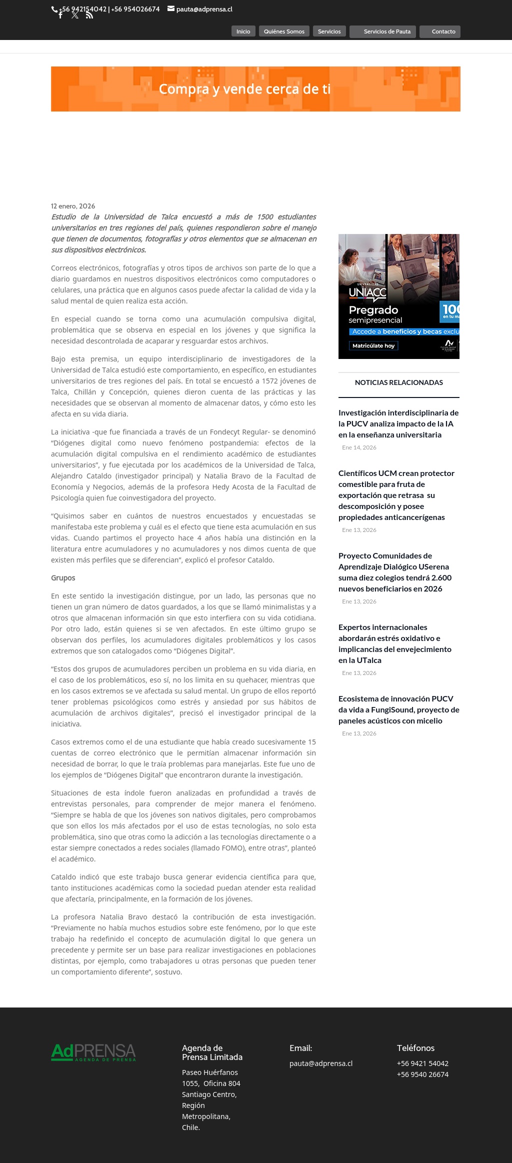 Correos electrónicos, fotografías y otros tipos de archivos son parte de lo que a diario guardamos en nuestros dispositivos electrónicos como computadores o celulares, una práctica que en algunos casos puede afectar la calidad de vida y la salud mental de quien realiza esta acción. En especial cuando se torna como una acumulación compulsiva digital, problemática que se observa en especial en los jóvenes y que significa la necesidad descontrolada de acaparar y resguardar estos archivos. Bajo esta premisa, un equipo interdisciplinario de investigadores de la