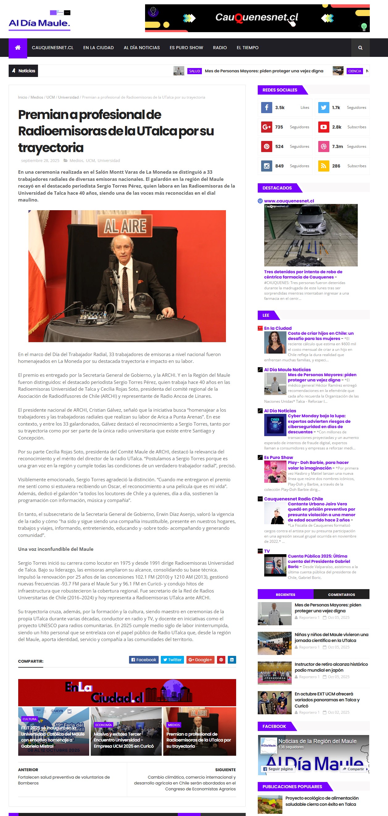 Universidad de Talca hace 40 años, siendo una de las voces más reconocidas en el dial maulino. En el marco del Día del Trabajador Radial, 33 trabajadores de emisoras a nivel nacional fueron homenajeados en La Moneda por su destacada trayectoria e impacto en su labor. El premio es entregado por la Secretaría General de Gobierno, y la ARCHI.
