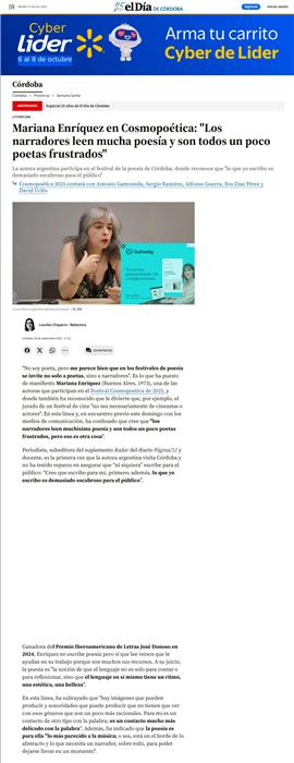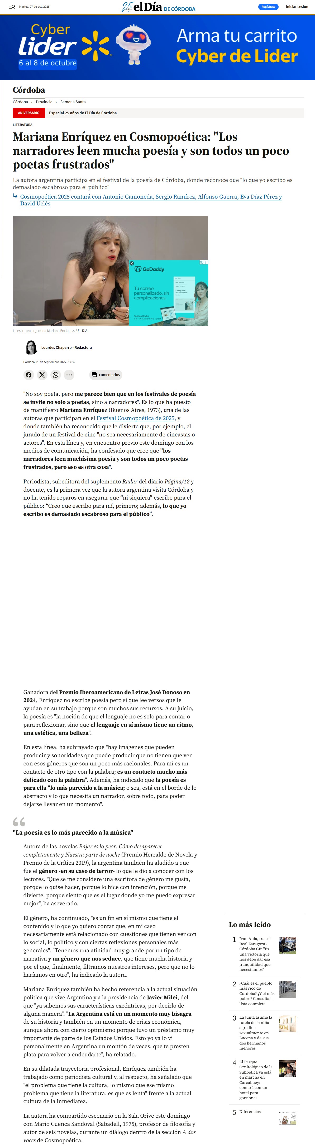 La autora argentina participa en el festival de la poesía de Córdoba, donde reconoce que "lo que yo escribo es demasiado escabroso para el público" "No soy poeta, pero me parece bien que en los festivales de poesía se invite no solo a poetas, sino a narradores". Es lo que ha puesto de manifiesto Mariana Enríquez (Buenos Aires, 1973), una de las autoras que participan en el Festival Cosmopoética de 2025, y donde también ha reconocido que le divierte que, por ejemplo, el jurado de un festival de cine "no sea necesariamente de cineastas o actores". En esta línea y, en encuentro previo este domingo con los medios de comunicación, ha confesado que cree que "los narradores leen muchísima poesía y son todos un poco poetas frustrados, pero eso es otra cosa". Periodista, subeditora del suplemento Radar del diario Página/12 y docente, es la primera vez que la autora argentina visita Córdoba y no ha tenido reparos en asegurar que “ni siquiera” escribe para el público: “Creo que escribo para mí, primero; además, lo que yo escribo es demasiado escabroso para el público”. Ganadora del Premio Iberoamericano de Letras José Donoso en 2024, Enríquez no escribe poesía pero sí que lee versos que le ayudan en su trabajo porque son muchos sus recursos.