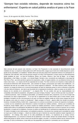 Camino al plebiscito En relación a si esta medida podría inferir en la participación del plebiscito de octubre, la especialista asegura que si se lleva un proceso con la correcta fiscalización y el aporte de la ciudadanía, el proceso se podría ver beneficiado de un sentimiento de seguridad para salir a votar: “El miedo al contagio lo viven ciertos grupos, no la población productiva, y los jóvenes han mostrado que la necesidad de cambio es mayor que el miedo al contagio (…) desde esa mirada creo que si hacemos las cosas bien podemos inspirar seguridad en la ciudadanía “. Sin embargo, Brito repara en las altas posibilidades del rebrote, y la importancia de su manejo correcto: “Epidemiológicamente, si yo menciono la historias de las epidemias a nivel mundial, siempre han existido rebrotes. El riesgo de rebrote está porque es natural, vamos a hacer que las personas salgan y se junten, y no tenemos todavía vacuna, entonces existe ese riesgo. El cómo lo enfrentamos, si esas olitas son más pequeñitas y las podemos ir controlando, eso es lo relevante”.