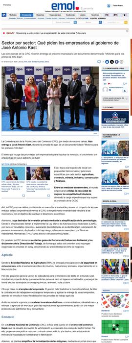 Las seis ramas de la CPC hicieron entrega al próximo mandatario un documento denominado "Motores para los primeros 100 días". La Confederación de la Producción y del Comercio (CPC), por medio de sus seis ramas, hizo entrega a José Antonio Kast, durante la jornada de ayer, de un documento titulado "Motores para los primeros 100 días". El texto que recoge las prioridades del empresariado para impulsar la inversión, el crecimiento y el empleo bajo el nuevo gobierno de Kast.