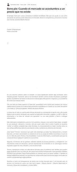 El llamado “bono pie” vuelve a tensionar el debate inmobiliario. Más que una ayuda, su uso como simulación de precios puede distorsionar el mercado, afectar la competencia y encarecer el acceso a la vivienda, advierte Alberto Alarcón. En una columna anterior sobre el subsidio a la tasa hipotecaria advertí algo incómodo: estos impulsos pueden “funcionar”, pero si se normalizan, tienden a elevar el piso de precios y postergar ajustes. El problema de fondo es estructural: el desacople entre precios e ingresos y un ecosistema de costos que empuja al alza. Con ese telón de fondo aparece el “bono pie”, presentado como ayuda para comprar con menos capital inicial. El punto no es atacar toda promoción: el problema es cuando se usa como simulación y se instala un “precio de papeles” distinto del precio efectivo. La línea roja en esto es cuando parte del pie declarado no corresponde al aporte real y ello puede implicar que el precio declarado sea superior al realmente convenido y pagado. La ABIF lo dijo sin eufemismos: si se trata de “simular una operación”, es una mala práctica, y llamó a entregar antecedentes. Esto distorsiona competencia y precios. En la práctica, empuja a una carrera hacia abajo: competir no por producto, ubicación o servicio, sino por quién estira más la señal.
