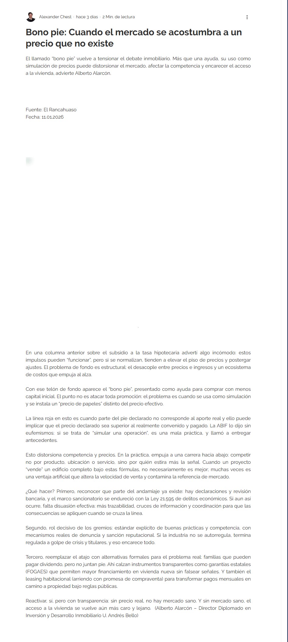 Cuando un proyecto “vende” un edificio completo bajo estas fórmulas, no necesariamente es mejor; muchas veces es una ventaja artificial que altera la velocidad de venta y contamina la referencia de mercado. ¿Qué hacer? Primero, reconocer que parte del andamiaje ya existe: hay declaraciones y revisión bancaria, y el marco sancionatorio se endureció con la Ley 21.595 de delitos económicos. Si aun así ocurre, falta disuasión efectiva: más trazabilidad, cruces de información y coordinación para que las consecuencias se apliquen cuando se cruza la línea. Segundo, rol decisivo de los gremios: estándar explícito de buenas prácticas y competencia, con mecanismos reales de denuncia y sanción reputacional. Si la industria no se autorregula, termina regulada a golpe de crisis y titulares, y eso encarece todo. Tercero, reemplazar el atajo con alternativas formales para el problema real: familias que pueden pagar dividendo, pero no juntan pie. Ahí calzan instrumentos transparentes como garantías estatales (FOGAES) que permiten mayor financiamiento en vivienda nueva sin falsear señales. Y también el leasing habitacional (arriendo con promesa de compraventa) para transformar pagos mensuales en camino a propiedad bajo reglas públicas. Reactivar, sí, pero con transparencia: sin precio real, no hay mercado sano. Y sin mercado sano, el acceso a la vivienda se vuelve aún más caro y lejano. (Alberto Alarcón – Director Diplomado en Inversión y Desarrollo Inmobiliario U.