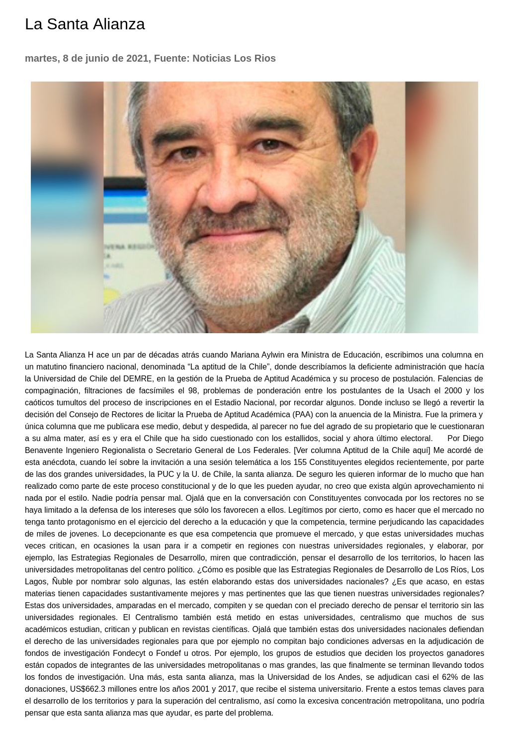 La Santa Alianza H ace un par de décadas atrás cuando Mariana Aylwin era Ministra de Educación, escribimos una columna en un matutino financiero nacional, denominada “La aptitud de la Chile”, donde describíamos la deficiente administración que hacía la Universidad de Chile del DEMRE, en la gestión de la Prueba de Aptitud Académica y su proceso de postulación. Falencias de compaginación, filtraciones de facsímiles el 98, problemas de ponderación entre los postulantes de la Usach el 2000 y los caóticos tumultos del proceso de inscripciones en el Estadio Nacional, por recordar algunos. Donde incluso se llegó a revertir la decisión del Consejo de Rectores de licitar la Prueba de Aptitud Académica (PAA) con la anuencia de la Ministra. Fue la primera y única columna que me publicara ese medio, debut y despedida, al parecer no fue del agrado de su propietario que le cuestionaran a su alma mater, así es y era el Chile que ha sido cuestionado con los estallidos, social y ahora último electoral.     Por Diego Benavente Ingeniero Regionalista o Secretario General de Los Federales. [Ver columna Aptitud de la Chile aquí] Me acordé de esta anécdota, cuando leí sobre la invitación a una sesión telemática a los 155 Constituyentes elegidos recientemente, por parte de las dos grandes universidades, la PUC y la U. de Chile, la santa alianza. De seguro les quieren informar de lo mucho que han realizado como parte de este proceso constitucional y de lo que les pueden ayudar, no creo que exista algún aprovechamiento ni nada por el estilo. Nadie podría pensar mal. Ojalá que en la conversación con Constituyentes convocada por los rectores no se haya limitado a la defensa de los intereses que sólo los favorecen a ellos. Legítimos por cierto, como es hacer que el mercado no tenga tanto protagonismo en el ejercicio del derecho a la educación y que la competencia, termine perjudicando las capacidades de miles de jovenes. Lo decepcionante es que esa competencia que promueve el mercado, y que estas universidades muchas veces critican, en ocasiones la usan para ir a competir en regiones con nuestras universidades regionales, y elaborar, por ejemplo, las Estrategias Regionales de Desarrollo, miren que contradicción, pensar el desarrollo de los territorios, lo hacen las universidades metropolitanas del centro político. ¿Cómo es posible que las Estrategias Regionales de Desarrollo de Los Ríos, Los Lagos, Ñuble por nombrar solo algunas, las estén elaborando estas dos universidades nacionales? ¿ Es que acaso, en estas materias tienen capacidades sustantivamente mejores y mas pertinentes que las que tienen nuestras universidades regionales? Estas dos universidades, amparadas en el mercado, compiten y se quedan con el preciado derecho de pensar el territorio sin las universidades regionales. El Centralismo también está metido en estas universidades, centralismo que muchos de sus académicos estudian, critican y publican en revistas científicas. Ojalá que también estas dos universidades nacionales defiendan el derecho de las universidades regionales para que por ejemplo no compitan bajo condiciones adversas en la adjudicación de fondos de investigación Fondecyt o Fondef u otros. Por ejemplo, los grupos de estudios que deciden los proyectos ganadores están copados de integrantes de las universidades metropolitanas o mas grandes, las que finalmente se terminan llevando todos los fondos de investigación. Una más, esta santa alianza, mas la Universidad de los Andes, se adjudican casi el 62% de las donaciones, US$662.3 millones entre los años 2001 y 2017, que recibe el sistema universitario. Frente a estos temas claves para el desarrollo de los territorios y para la superación del centralismo, así como la excesiva concentración metropolitana, uno podría pensar que esta santa alianza mas que ayudar, es parte del problema.|