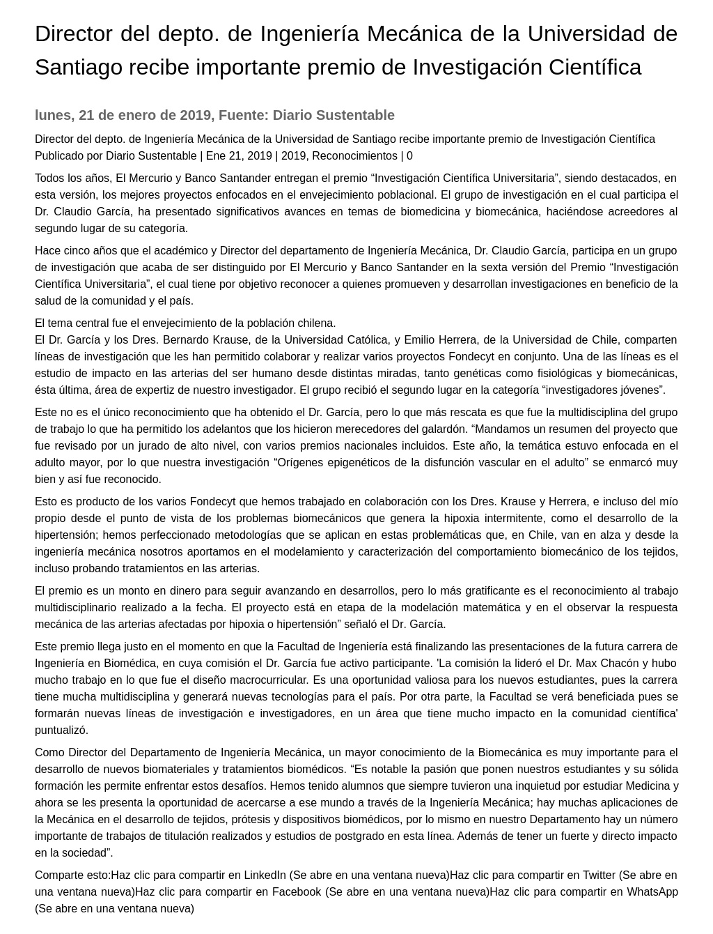 Director del depto. de Ingeniería Mecánica de la Universidad de Santiago recibe importante premio de Investigación Científica 21-01-2019 Diario Sustentable Director del depto. de Ingeniería Mecánica de la Universidad de Santiago recibe importante premio de Investigación Científica Publicado por Diario Sustentable | Ene 21,2019 | 2019, Reconocimien... |