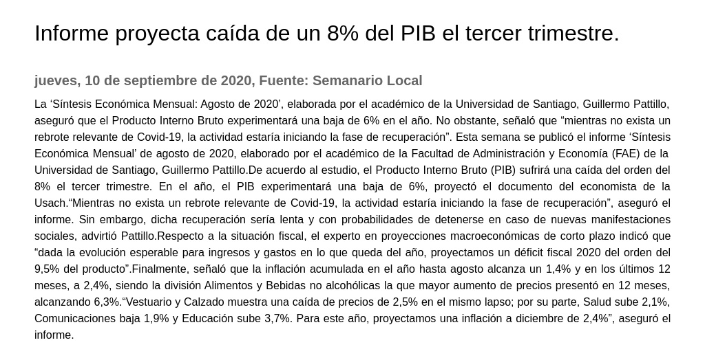 No obstante, señaló que “mientras no exista un rebrote relevante de Covid-19, la actividad estaría iniciando la fase de recuperación”. Esta semana se publicó el informe ‘Síntesis Económica Mensual’ de agosto de 2020, elaborado por el académico de la Facultad de Administración y Economía (FAE) de la Universidad de Santiago, Guillermo Pattillo. De acuerdo al estudio, el Producto Interno Bruto (PIB) sufrirá una caída del orden del 8% el tercer trimestre. En el año, el PIB experimentará una baja de 6%, proyectó el documento del economista de la Usach. “Mientras no exista un rebrote relevante de Covid-19, la actividad estaría iniciando la fase de recuperación”, aseguró el informe. Sin embargo, dicha recuperación sería lenta y con probabilidades de detenerse en caso de nuevas manifestaciones sociales, advirtió Pattillo.