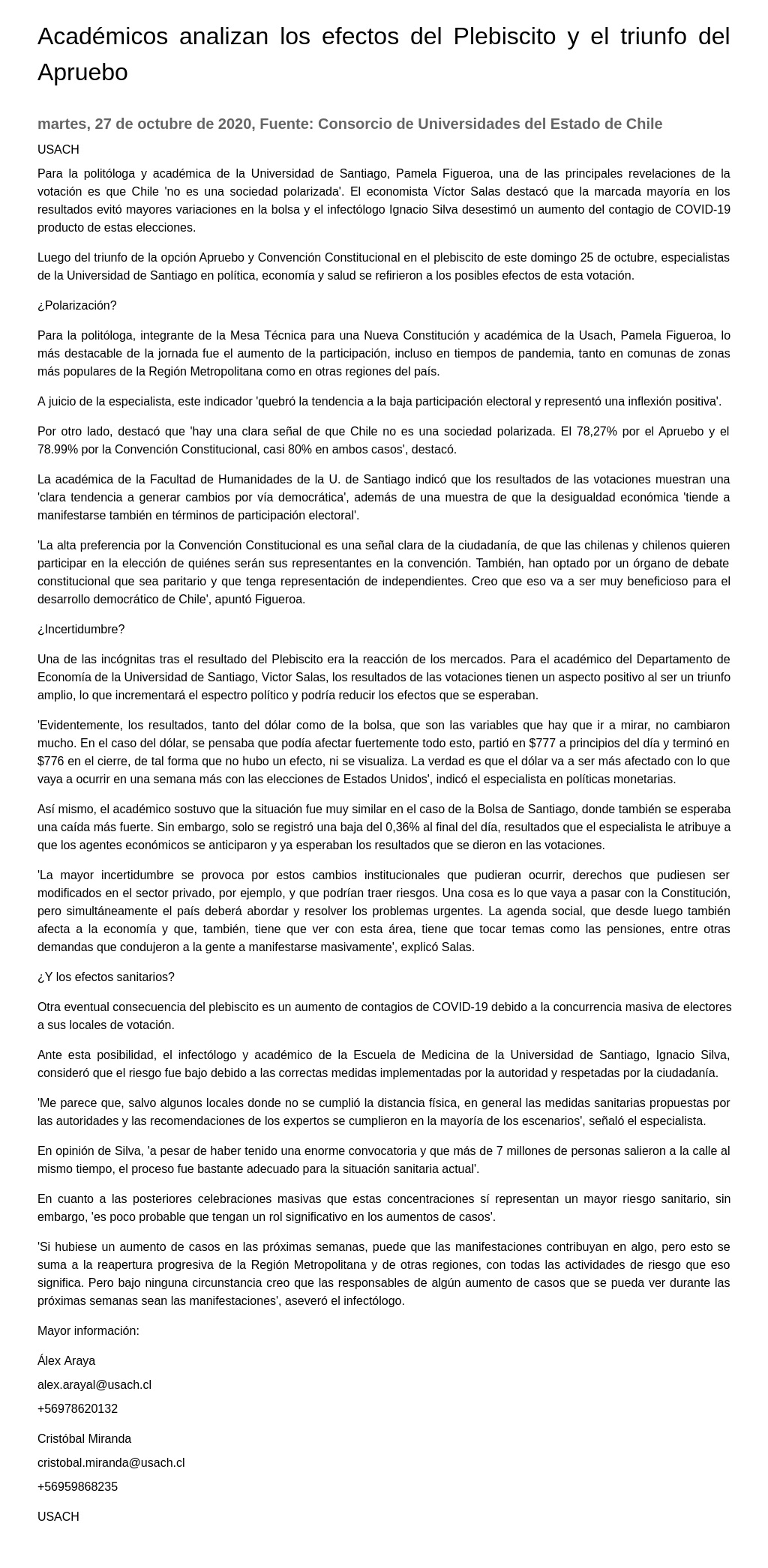 Luego del triunfo de la opción Apruebo y Convención Constitucional en el plebiscito de este domingo 25 de octubre, especialistas de la Universidad de Santiago en política, economía y salud se refirieron a los posibles efectos de esta votación.