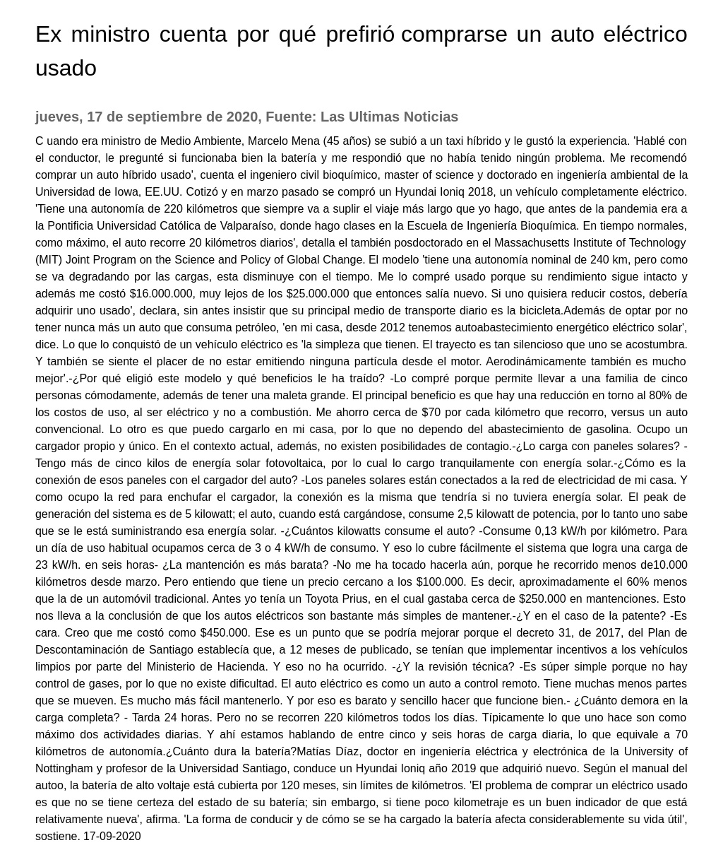 C uando era ministro de Medio Ambiente, Marcelo Mena (45 años) se subió a un taxi híbrido y le gustó la experiencia. "Hablé con el conductor, le pregunté si funcionaba bien la batería y me respondió que no había tenido ningún problema. Me recomendó comprar un auto híbrido usado", cuenta el ingeniero civil bioquímico, master of science y doctorado en ingeniería ambiental de la Universidad de Iowa, EE.UU.