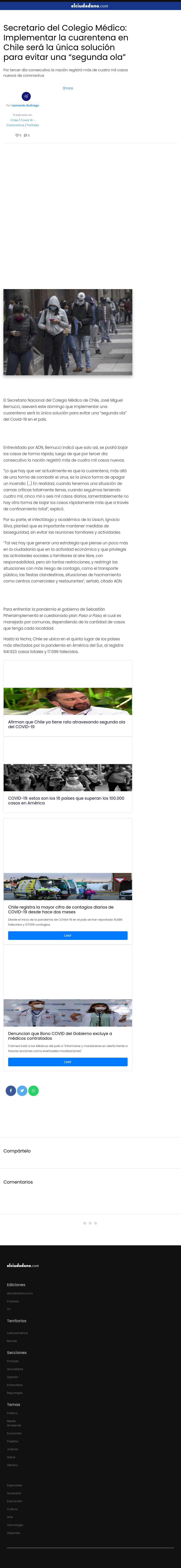 Por tercer día consecutivo la nación registró más de cuatro mil casos nuevos de coronavirus El Secretario Nacional del Colegio Médico de Chile, José Miguel Bernucci, aseveró este domingo que implementar una cuarentena será la única solución para evitar una “segunda ola” del Covid-19 en el país. Entrevistado por ADN, Bernucci indicó que solo así, se podrá bajar los casos de forma rápida, luego de que por tercer día consecutivo la nación registró más de cuatro mil casos nuevos.