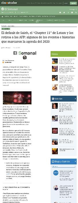 El default de Saieh, el “Chapter 11” de Latam y los retiros a las AFP: algunos de los eventos e historias que marcaron la agenda del 2020 por Iván Weissman 4 enero, 2021 El S emanal Por Iván Weissman Además, la irrupción del Grupo Patio, la popularidad en redes del Economista Flaite y la arremetida china en el mercado de energía chileno. También repasamos el impacto de la pandemia y la desigualdad, y las entrevistas que más me gustaron en estos seis meses que llevo escribiendo El Semanal. ¡Feliz Año! Se viene un 2021 lleno de incertidumbres. El año que terminó estuvo dominado por la pandemia y la crisis económica. El que comienza tendrá que además enfrentar los desafíos políticos de la Convención Constitucional y las elecciones presidenciales. Entremedio se viene el gran debate sobre una reforma a las pensiones. En esta edición especial de El Semanal aprovechamos de recordar los eventos más relevantes del 2020 y las entrevistas más interesantes que publicamos. Sin duda la caída de Saieh y la casi quiebra de Latam dominaron la agenda de Sanhattan. A eso hay que sumar la crisis que generaron los retiros a las AFP, la irrupción del Grupo Patio y la arremetida china en el mercado de energía chileno, entre otras. Son todas historias que contamos en este espacio. Espero que disfruten lo que elegí para compartir con ustedes. Antes de arrancar con lo que nos convoca, si alguien te compartió este boletín o nota, asegúrate de recibirlo todos los domingos por la noche, inscribiéndote a El Semanal AQUÍ. Y si ya estás inscrito, puedes compartirlo con un amigo, familiar o colega. 1 1- TRES PREGUNTAS AL ECONOMISTA FLAITE -Don Flaite, tres medidas económicas que implementaría si lo nombran ministro de Hacienda con poderes absolutos para ayudar a levantar la economía pospandemia. “a. - Incentivar las contrataciones formales. Deducción de impuestos de $100-$150 lucas al mes por trabajador nuevo de renta inferior a 60 UF, por 36 meses en las nuevas contrataciones. El crédito al impuesto se da por el aumento entre hoy y 36 meses y el promedio mensual de nuevos aumentos en el periodo. Se controla fácil vía info AFP”. “b. - Impuesto al monopolio y al todoteniente e incentivos a la competencia. Impuestos progresivos crecientes a empresas ke tengan más del 20%-25% de mercao en ciertas áreas ( retail, supermercados, telecomunicaciones, bancos y retail financiero, agua, generación eléctrica, distribución eléctrica, AFP, Producción alimentos, Cías de seguros, Isapres, forestal, minería, transporte aéreo, etc. ) y rebaja al antiguo 15% de la tasa de impuesto a las pymes y los ke tengan menos del 10% en esos sectores, pa incentivar competencia. Impuestos progresivos mayores a las sociedades o familias controladoras de dos o más empresas con participación de más del 10% en esos sectores. FNE genera normativa. ¿Quiere rebaja de impuestos? Emprenda o déjele espacio a que otros weones compitan”. “c. - Sacá de grasa jebi del Estado. Cortar programas ineficientes socialmente y potenciar a concho los ke llegan a los más, más pobres. Eliminar incentivos a subcotizar e informalidad. Incentivos a formalidad. Garrote a no pago de cotizaciones. Más datos socioeconómicos no falsificables: Big Data y la CTM y menos CASEN. El chileno es demasiao pillo pa esa weá”. -Describa el modelo chileno en menos de 240 caracteres. “-Capitalista pa las ganancias, socialista pa las pérdidas. Portarse como el pico es semigratis. Desde el ambulante hasta Piñera”. -Y pensiones: reparto, mixta, AFP con reformas “-La weá es bien simple. Sea privao o estatal, con 40 años de cotización al 10%. Son 4 sueldos anuales de ahorro. Réstale ke el 45% de los wns cotiza menos de 15 años y bajamos a 1.5 años de sueldos de ahorro pa ellos. Y la weá tiene ke durar como 22 en promedio. Aunque se multiplique por 3 la weá no da. Los dos temas son la baja cotización y la informalidá. Lo demás son puros voladores de luces de los weones ke kieren manotear los fondos”. 2 2- TRES PREGUNTAS A FERNANDO LARRAÍN El gerente general de las AFP ha estado en el ojo del huracán en estas últimas semanas. Desde que asumió en el cargo ha tenido una postura dialogante. En esta breve entrevista, a un mes de dejar su puesto, Larraín da su opinión sobre por qué ha sido tan difícil realizar un acuerdo transversal que se haga cargo del problema de las bajas pensiones en Chile. -El sistema entero está amenazado y el retiro del 10% ya fue aprobado. ¿Cómo se sale de esta de una manera en que todos ganen? - Si seguimos con la idea de que algunos ganan o pierden, no vamos a lograr avanzar. Acá la única manera de que los trabajadores y trabajadoras de Chile tengan mejores pensiones es que exista un consenso transversal sobre cómo avanzamos en una reforma previsional que efectivamente haga los cambios estructurales que se requieren al sistema para que sea sostenible en el largo plazo, forme parte de un sistema integral de protección a la vejez y entregue mejores pensiones. -En tu mirada, por qué ha sido tan difícil hacer una reforma que se haga cargo de las bajas pensiones. - Llevamos más de 10 años discutiendo cambios al sistema y vemos que aún no ha existido la verdadera voluntad política para avanzar en las modificaciones que realmente mejoran las pensiones. Acá no se trata de centrar el debate en las administradoras de fondos de pensiones, porque eso no mejora las pensiones. Acá lo que se debe decidir es cómo fortalecemos el rol del Estado, el mercado laboral para poder entregar salarios significativos y cómo fomentamos la densidad en la cotización obligatoria, entre otros temas. Hay algunos factores como, por ejemplo, discutir la edad de jubilación, que ha sido propuesto en todas las comisiones asesoras y aún no hemos ni siquiera discutido sobre ello. Mientras no haya un consenso y voluntad política, no veremos cambios reales en las pensiones. -Una autocrítica en 240 