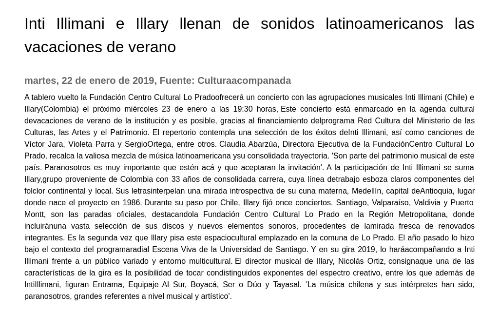 Inti Illimani e Illary llenan de sonidos latinoamericanos las vacaciones de verano 22-01-2019 Culturaacompanada A tablero vuelto la Fundación Centro Cultural Lo Pradoofrecerá un concierto con las agrupaciones musicales Inti Illimani (Chile) e Illary(Colombia) el próximo miércoles 23 de enero a las 19:30 horas,... |