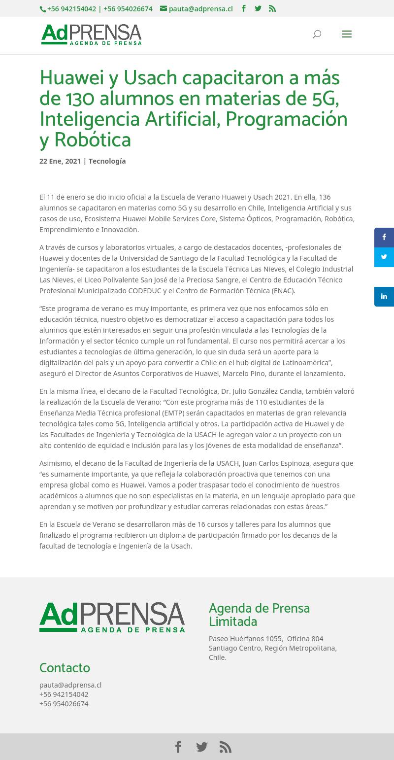 Huawei y Usach capacitaron a más de 130 alumnos en materias de 5G, Inteligencia Artificial, Programación y Robótica 22-01-2021 AD Prensa Huawei y Usach capacitaron a más de 130 alumnos en materias de 5G, Inteligencia Artificial, Programación y Robótica El 11 de enero se dio inicio oficial a la Escuela de Verano Huawei y Usach 2021. ... |