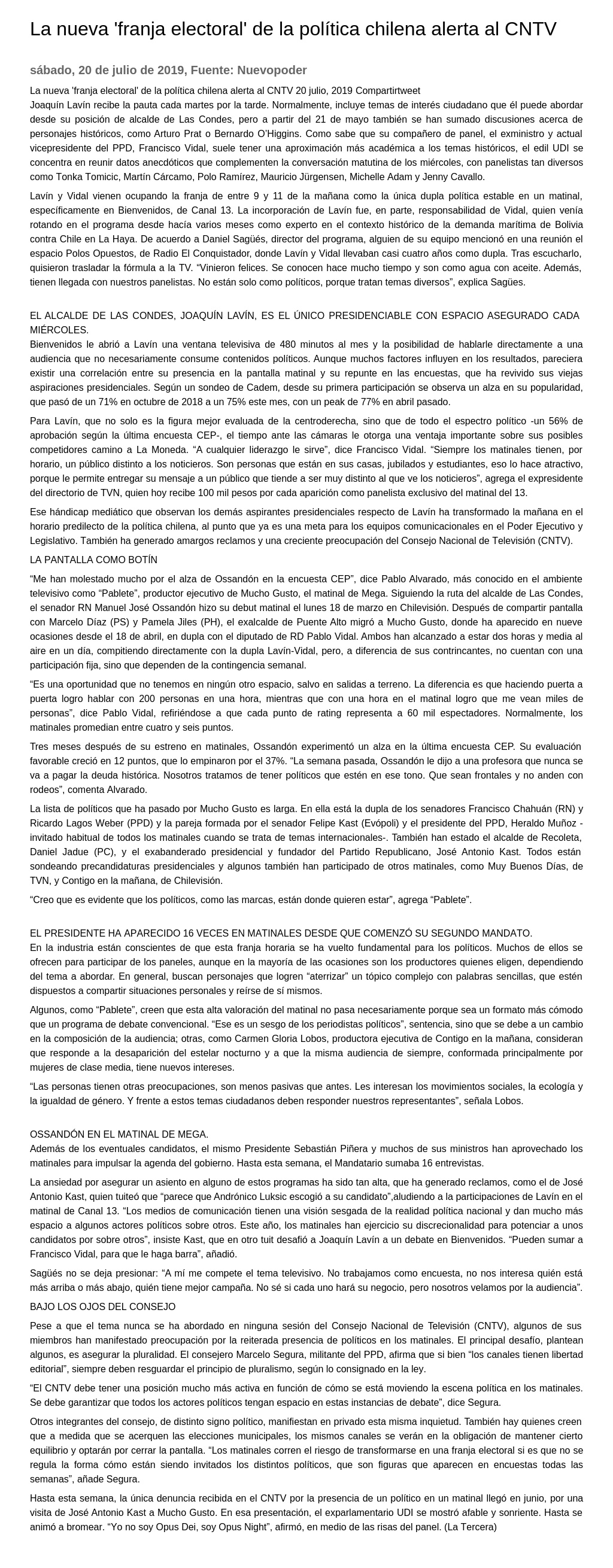 La nueva "franja electoral" de la política chilena alerta al CNTV 20-07-2019 Nuevopoder La nueva "franja electoral" de la política chilena alerta al CNTV 20 julio, 2019 Compartirtweet Joaquín Lavín recibe la pauta cada martes por la tarde. Normalmente, incluye temas de interés ... |