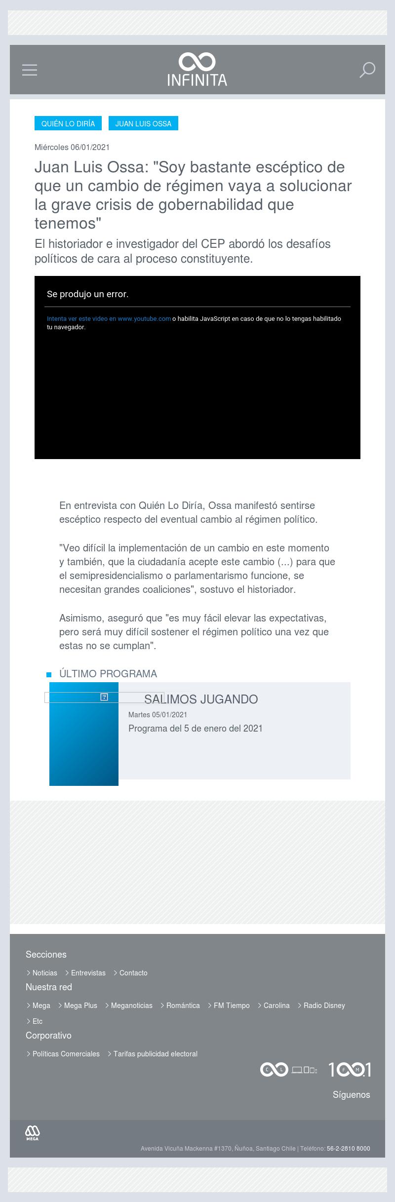 Juan Luis Ossa: "Soy bastante escéptico de que un cambio de régimen vaya a solucionar la grave crisis de gobernabilidad que tenemos" 06-01-2021 Radio Infinita El historiador e investigador del CEP abordó los desafíos políticos de cara al proceso constituyente. } En entrevista con Quién Lo Diría, Ossa manifestó sentirse escéptico respecto del eventual camb... |