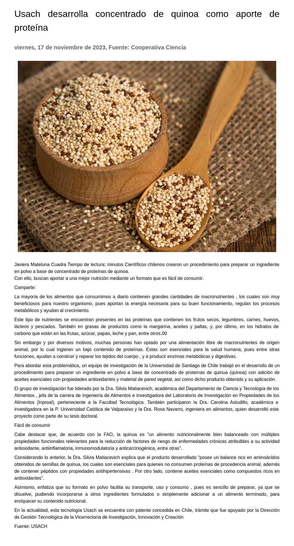 Usach desarrolla concentrado de quinoa como aporte de proteína 17-11-2023 Cooperativa Ciencia Javiera Mateluna Cuadra Tiempo de lectura: minutos Científicos chilenos crearon un procedimiento para preparar un ingrediente en polvo a base de concentrado de proteínas de quinoa. Con ello, bus... |